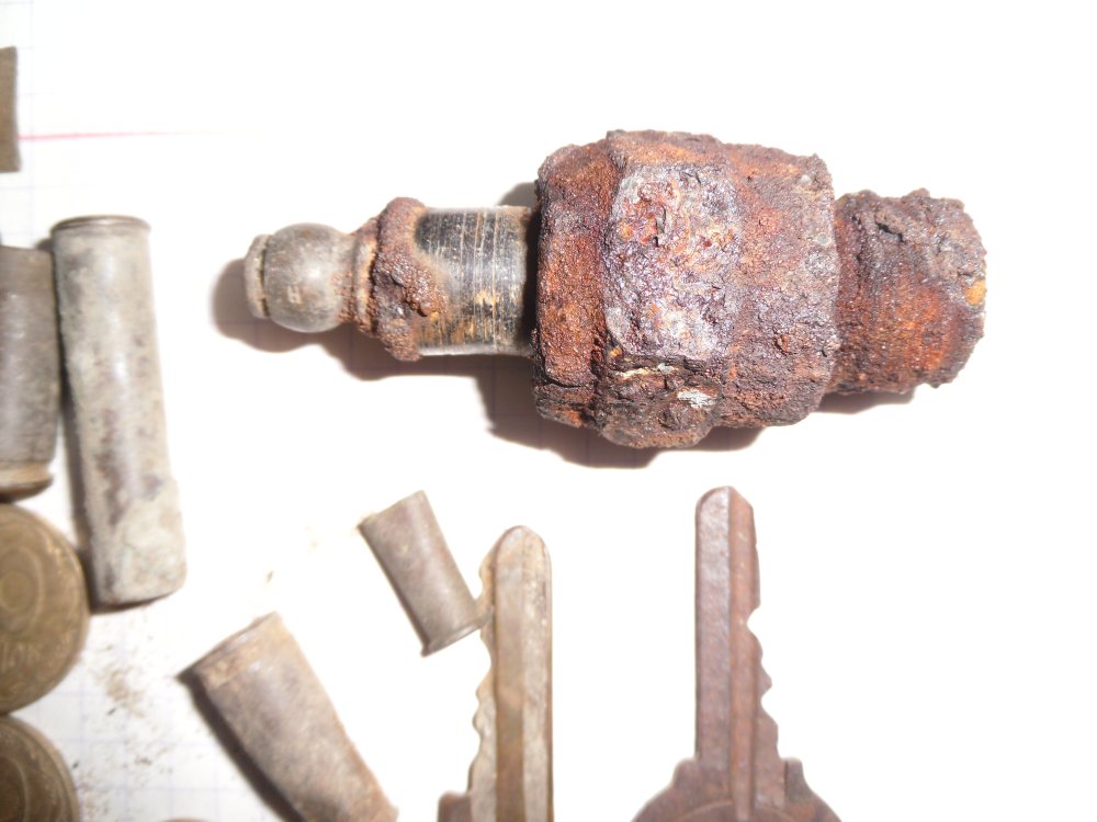 Сегодня решил покопать на небольшом пляже. Сезон купания закончился, думал никто мешать не будет. Пришёл, развернулся, начал копать. Сигналов очень много. Пошли первые находки - современная ходячка, монеты СССР, ключи. Копал минут 30, не больше. И тут пастухи вдоль речки гонят стадо. Коровы на звук МД подошли и стоят смотрят. Я хожу, а они стоят и внимательно смотрят. Некоторые вплотную подошли. Во любознательные животные. Я так ещё минут 5 покопал, свернулся и пошёл. На обратной дороге решил пройтись по сосновому лесу вдоль реки. Там очень много окопов, траншей по 43 году. А в лесу другая напасть - грибники. Сегодня погода хорошая, так их тьма в лесу. Идут чуть - ли ни цепью, с палками, подгребая на своём пути все грибы. После них ни одного гриба не видел. И тоже с вопросами - а что, а как? Нашёл пустой цинк, немного гильз и интересную свечу зажигания на позициях танкистов. Я раньше такой не встречал.