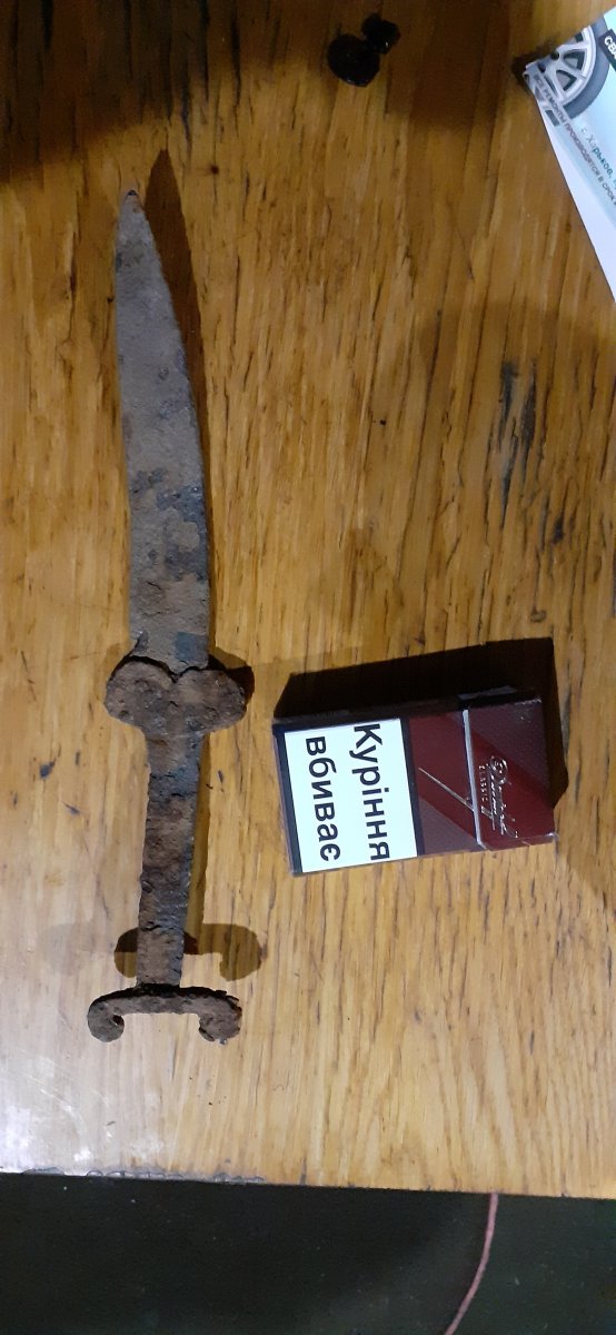Привет всей честной компании! С пожеланиями здоровья и удачи всем!!! Гость я редкий, давным-давно не писал. По 2 причинам: лень-матушка и находки, о которых даже рассказывать неохота по причине банальности.как у всех (+/-). За прошедшее время было только 1 находка, достойная внимания. Крест Киевской Руси в идеальном состоянии (определили как домонгольский период 11-12 век). Я его в Черкасской области на битом-перебитом поле поднял, у нас такие попадались кому нибудь,интересно? Ну были там пару пятаков, убитые в хлам(((, пара билонов, ну и таке всяке что у всех присутствующих тоже имеется. Нужен мне совет ваш, парни. Дело вот в чём: сегодня в лесу у Зарожного, неожиданно, поднял вот такую чернь, это при том что я черные сигналы не копаю. Звонил на терке как чугунина, глубина сантиметров 5-7 (я вообще офигел). Я так понимаю это акинак? Вопрос знатокам: что мне с ним делать??? Как поступают со старой черниной, чтоб не посыпалась? Ну и стоит ли чего такое добро?