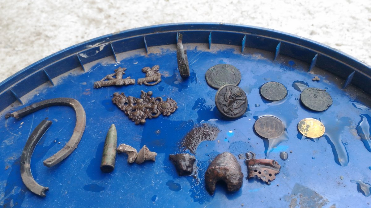 Приветствую любителей приборного поиска. Любуясь отчётами решил показать свои достижения за 2 крайних выезда.Планировалась поездка в Черемушное, но профессионалы уже по дороге на место отговорили, поехали " на удачу". Первый день центр села, второй - проверка местной легенды. мыть монетки старался сразу краевиди после баньки серебрушка: польский полторак (лежал с верху) рядом на пол штыка найдена деньга 1739. Обручалка-медь, пару пуговиц орлянок в сохране , на топорах и пушках. интересной формы крестик -явно казацкий. Еще цветные сигналы что мимо мусорки была и керамика . Советов было не много и они сразу летели в сумку, мимо хабарницы. Какой коп без окупационной галантереи . Фашиский значёк с паровозиком подарок местного. Легенда пока остаёться легендой.