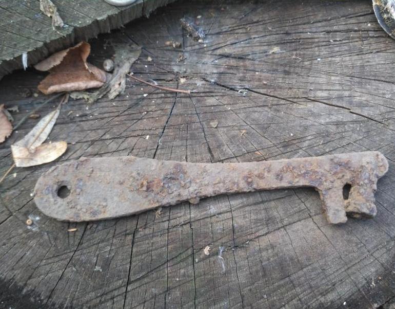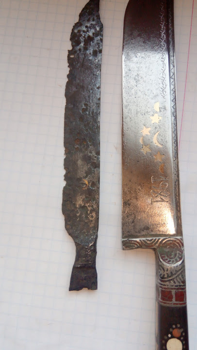 Вітаю. Декілька виходів. Знайшлася проколка, стремя- ковані, поки киснуть. Обручці, спочатку, зрадів, але на місці проби велика литера "А" та двійка римська, на йод не реагує. Поруч з обручкою, скоріш свинцева куля, чомусь занадто розцяцькована. Ще один уламок свинцю, з більшими окислами. От з ножем цікаво- не пішов до брухту через те, що кований, та перехід леза в ручку нетрадиційний. Під час розчистки виявилася всічка бронзою- ніпівмісяць, згадався пчак ( на світлині поруч, знайдений значно раніше, новороб), але там роги півмісяця догори, ще й зірки.