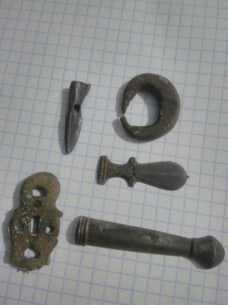 вчера была разведка. сегодня уже целенаправленно приехали где было вчера найдено колечко и остаток гарды. находки удивили! так как раньше по культурам не копал. подскажите по находкам в низу на втором фото материал похоже серебро, (беленькое)