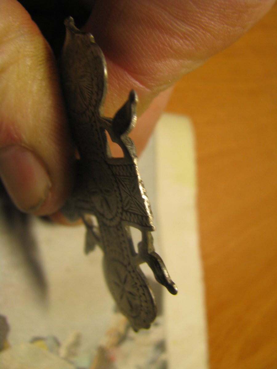 На месте обломки была старая патина,это я уже наждачкой зачистил,да и место ,где поднял крест-это просто мусорка возле домовой ямы,что то искать,шурфить бесполезно,хотя для приличия пол часика покрутился безрезультатно.Cейчас пороюсь в своей теме-был у меня случай,поднял германский знак за три атаки,за три раза.