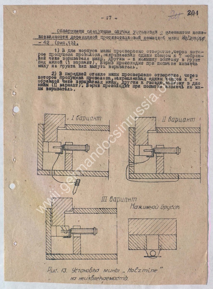 А як німці ставили у 1941-43 роках міни на розвантаження, якщо в них не було відповідних підривників? На відміну від тієї ж РСЧА. Способів встановлення T.Mi.35 на невилучення є лише кілька, завдяки достатній кількості додаткових гнізд для підривників. Так, німці встановлювали навіть по усі два підривники і такі міни можуть бути небезпечними досі. Але є приклади встановлення навіть мін взагалі без додаткових гнізд - у дерев"яній міні Holzmine 42 (V.B.Mi.I.), див. малюнок нижче. А підривник S.Z.44 на теренах України просто не використовувався, бо не встиг. На малюнку також нижче