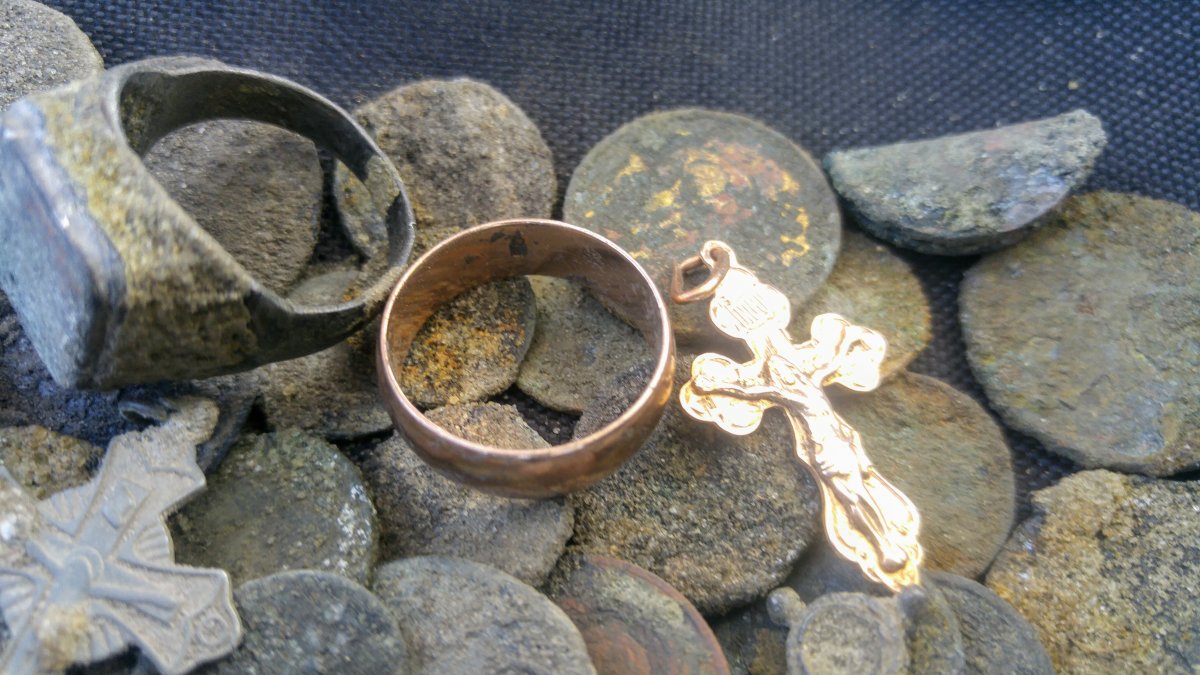 Третий день в поисках золота на советском пересохшем ставке принес еще 6,5 гр золота- обручалка и крест,с утра купил грабли,взял на помощь жену и вот результат.Вычищаем участок граблями,и не спеша сканируем,моя система даёт обалденные результаты