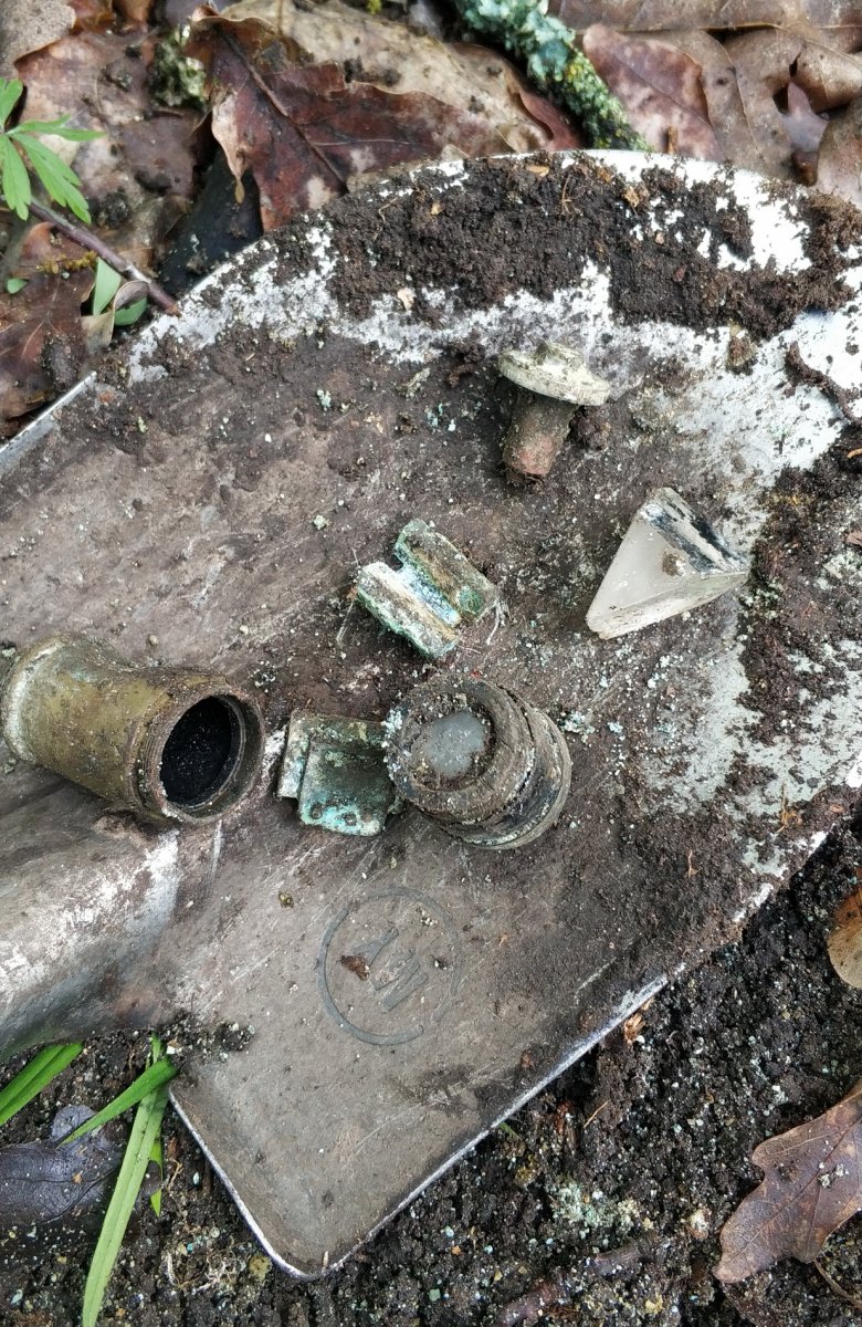 Вернее все, что от него осталось. Корпус похоже был из тонкого силумина, в земле от него остались только белесый порошок.