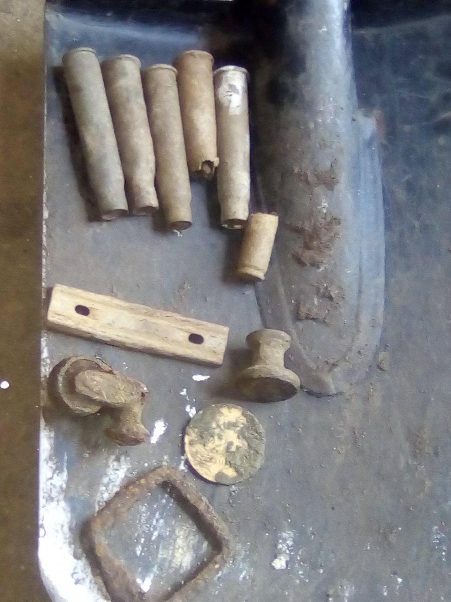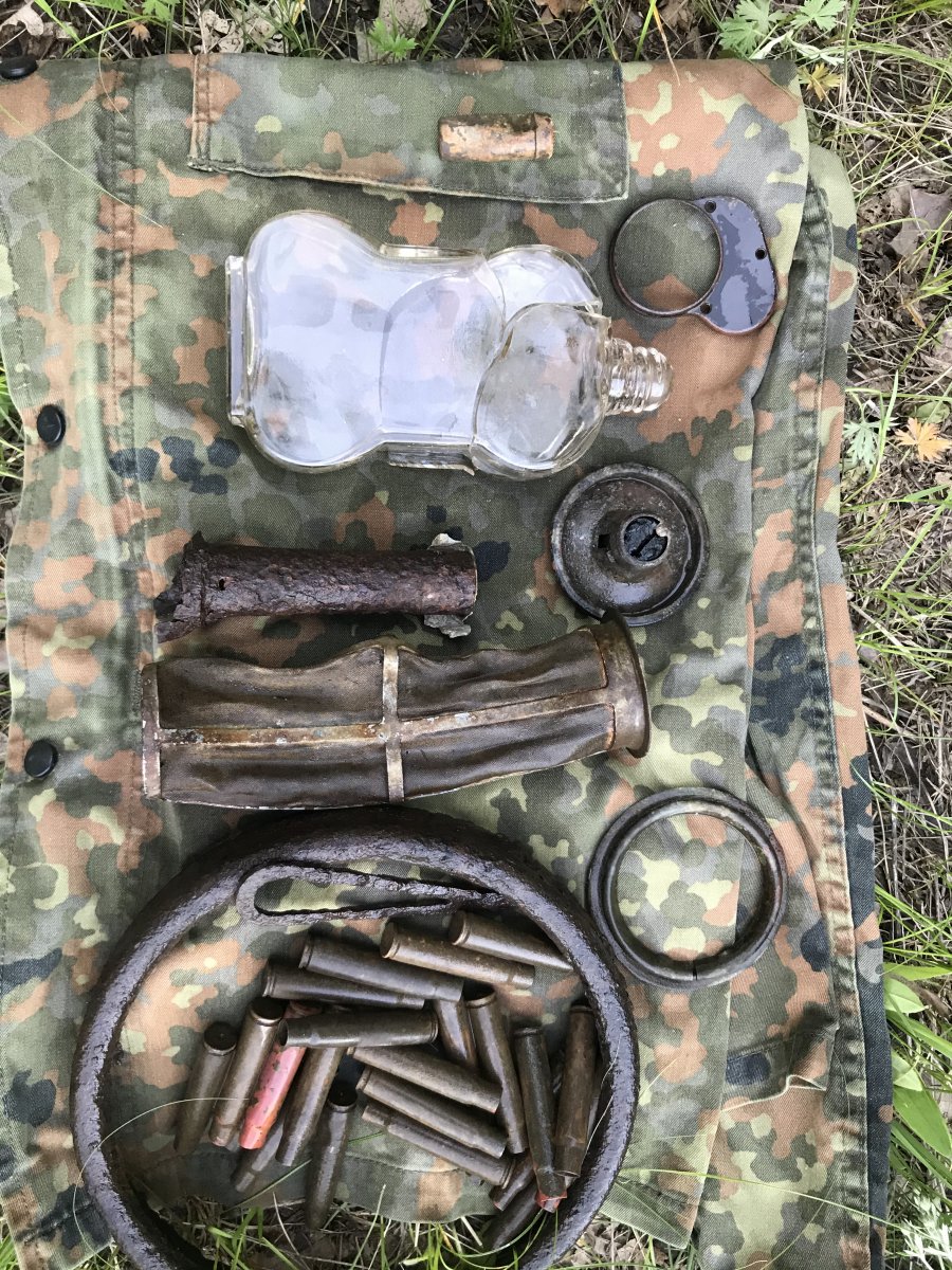 Доброго камрады. Вот и мы тоже выбрались с друзьями послушать земельку. Про жару писать не буду, а насчёт воды надо брать с собой побольше, сколько в рюкзаке сможешь носить. По находкам, старина и древность прошла мимо нас, а была только война она везде. Были моменты ,когда пришли на ганс позиции, а там один настрел, после получаса копа ты понимаешь, что найти среди гильз что то интерсное очень трудно. Иногда попадались крышечки от м-24 и пояски. Когда от этого просто устали решили переехать в другое место. По дороге в лесу сели мостом в луже. Работа в три лопаты помогла нам продолжить путь. На новом месте друзьям попался трак и красивая монетка 5 рейс пфенингов с алюминиевой бронзы. А у меня из интересного назвонилось колечко из французской монеты. Внутри колечка хорошо видны надписи. Рядом лежали две крышечки от крема, один точно французский. И ещё были находки.