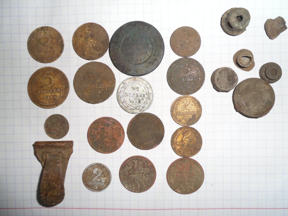 Результаты вчерашнего "похода". Редких нет. А более-менее интересные: подуставшие 5 копеек 1880 года, 20 коп 1923 в отличном сохране и 20 коп 1937 года. А ещё попался замок от подтяжек времён империи, с позолотой и орнаментом.