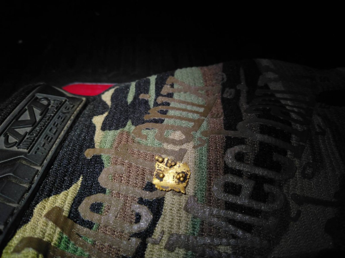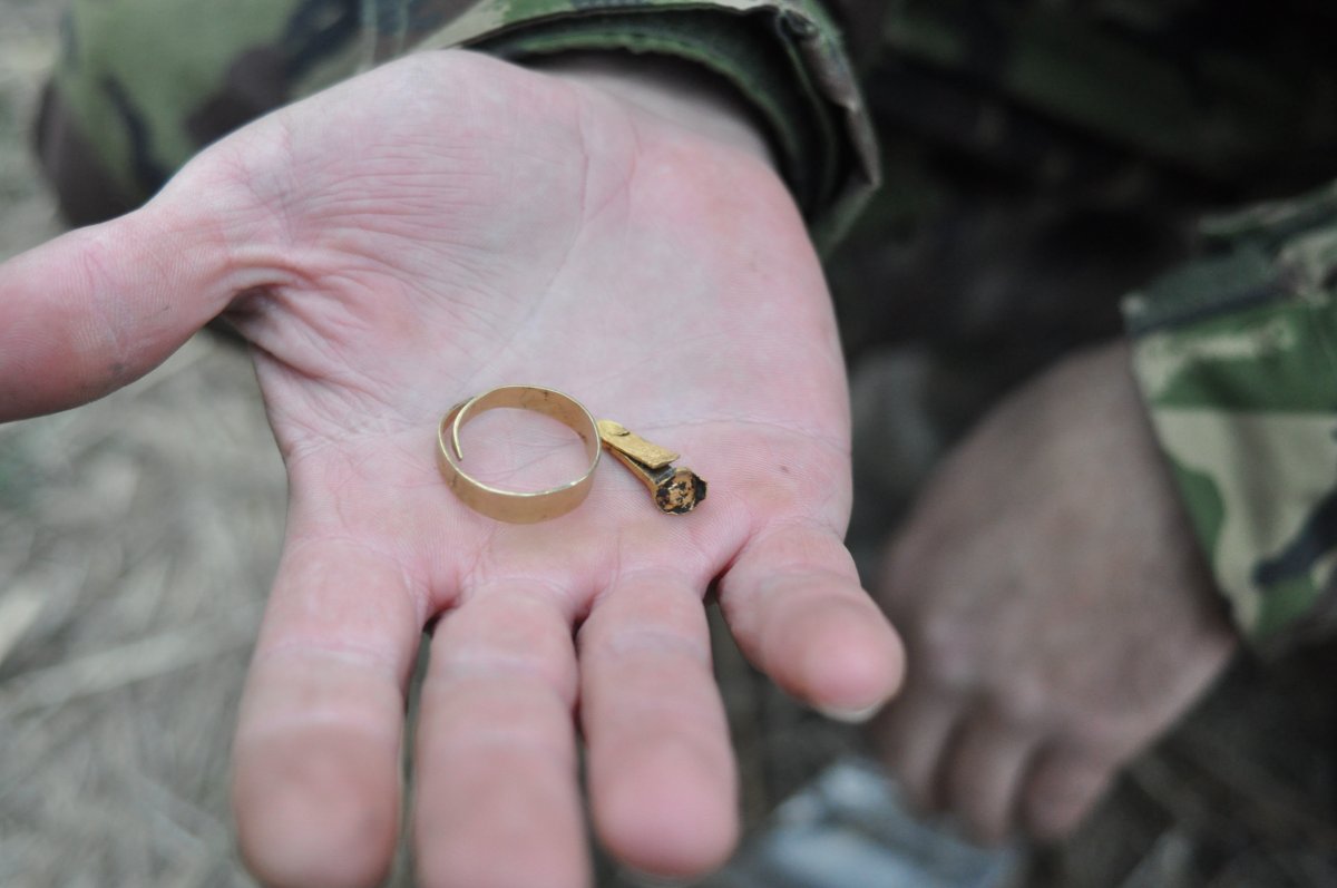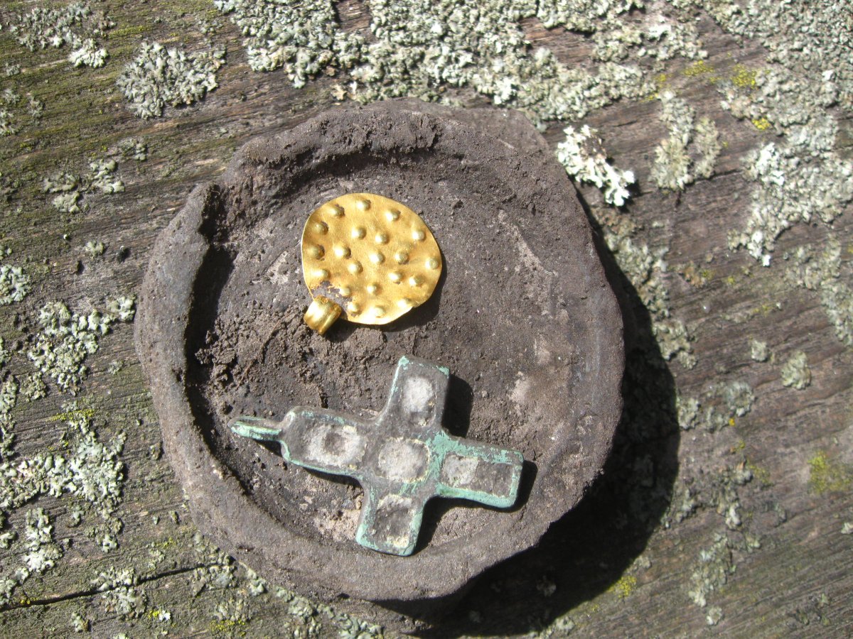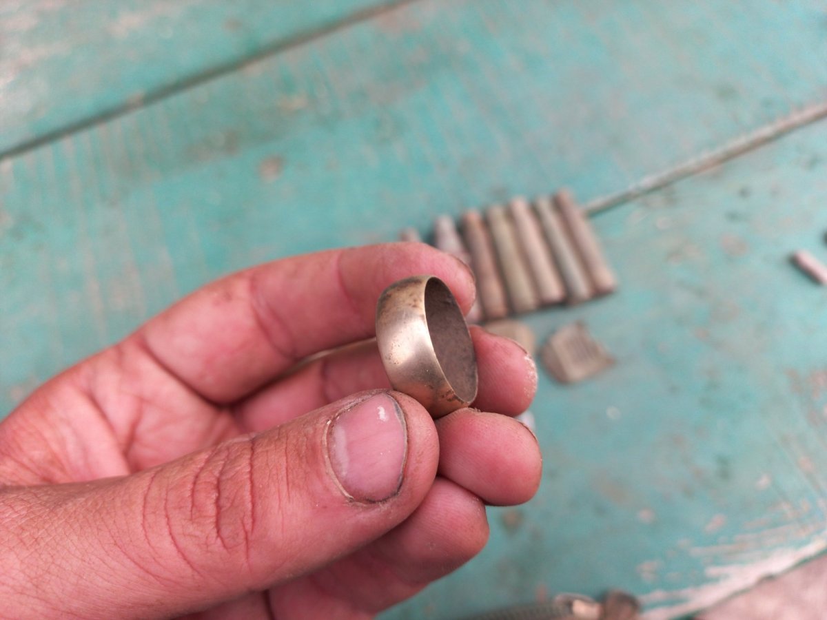 Всем привет. Поигрался пару часов с 50-й частотой на поле ЧК, толком ничего не накопал - фибулу да кусочек серебра. Перебрался в лес, где при даунхилле вылетел с велика, благо далеко не улетел, всего пару метров. Но бочок побаливает. Надолго не хватило, минут 30 покопал и покатил домой, а то больно было нагибаться. З.Ы. Обручалка судя по красноватым пятнам из пятака советского.
