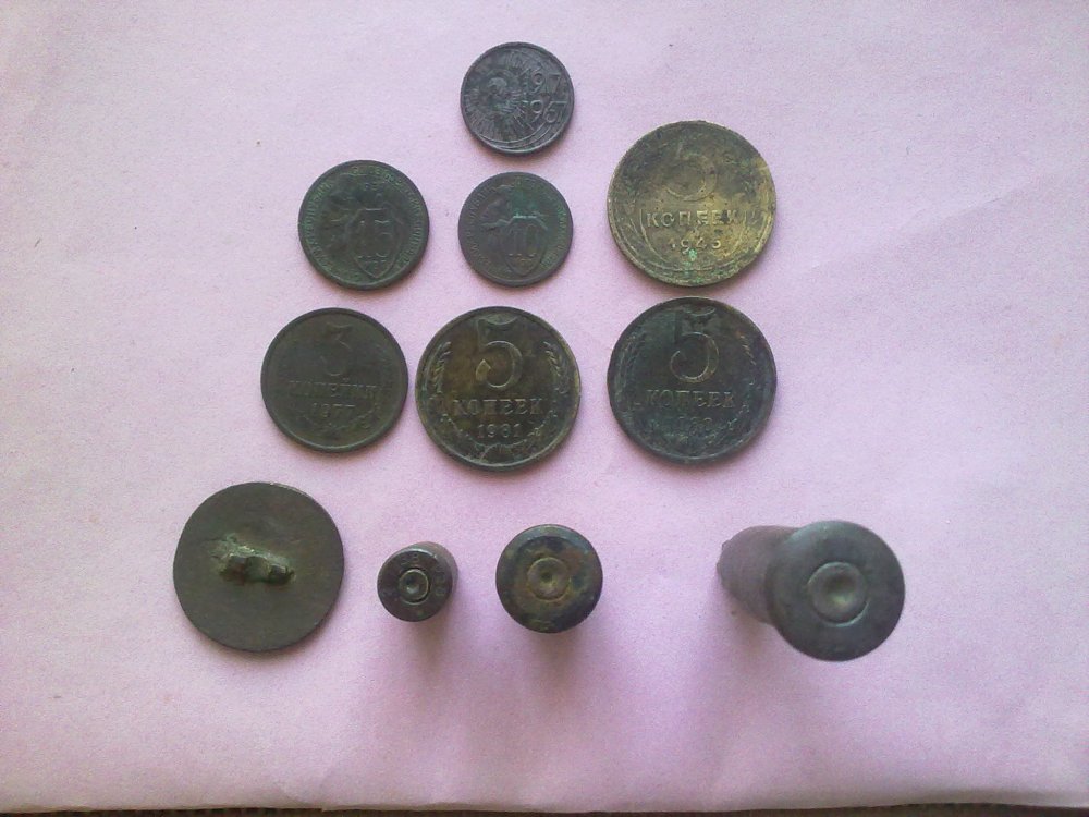 Один мотлох - колья от палаток ( алюминий), пуговицы, пару монет - оккупационная Польша, настрел МП, Маузер, эрликоновские гильзы и целые выстрелы. Медная бирка с огнетушителя и самодельная заколка на галстук: