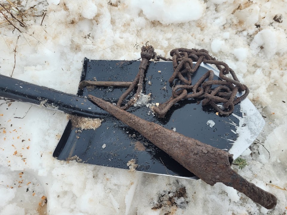 Доброго всем. Сегодня с товарищем покопали. Решили погулять по верхам, снега правда много сантиметров 20,местами и больше. Но если сигналы есть то аппарат видит. Как для такого снега находки и нормальные. У меня из интересного лента с мг бодрая, кистень с сломанным ушком, кованная кошка с цепью, и неизвестная гайка, попадается уже пятая и только в этом месте на арт позициях, может кто подскажет с чего она. И порадовала целая бутылочка чекушка с ячейки РККА. Настрела не много. У товарища из интересного ключ разводной жаль сломан, отвёртка Мосина, ну и чермета кил 15.