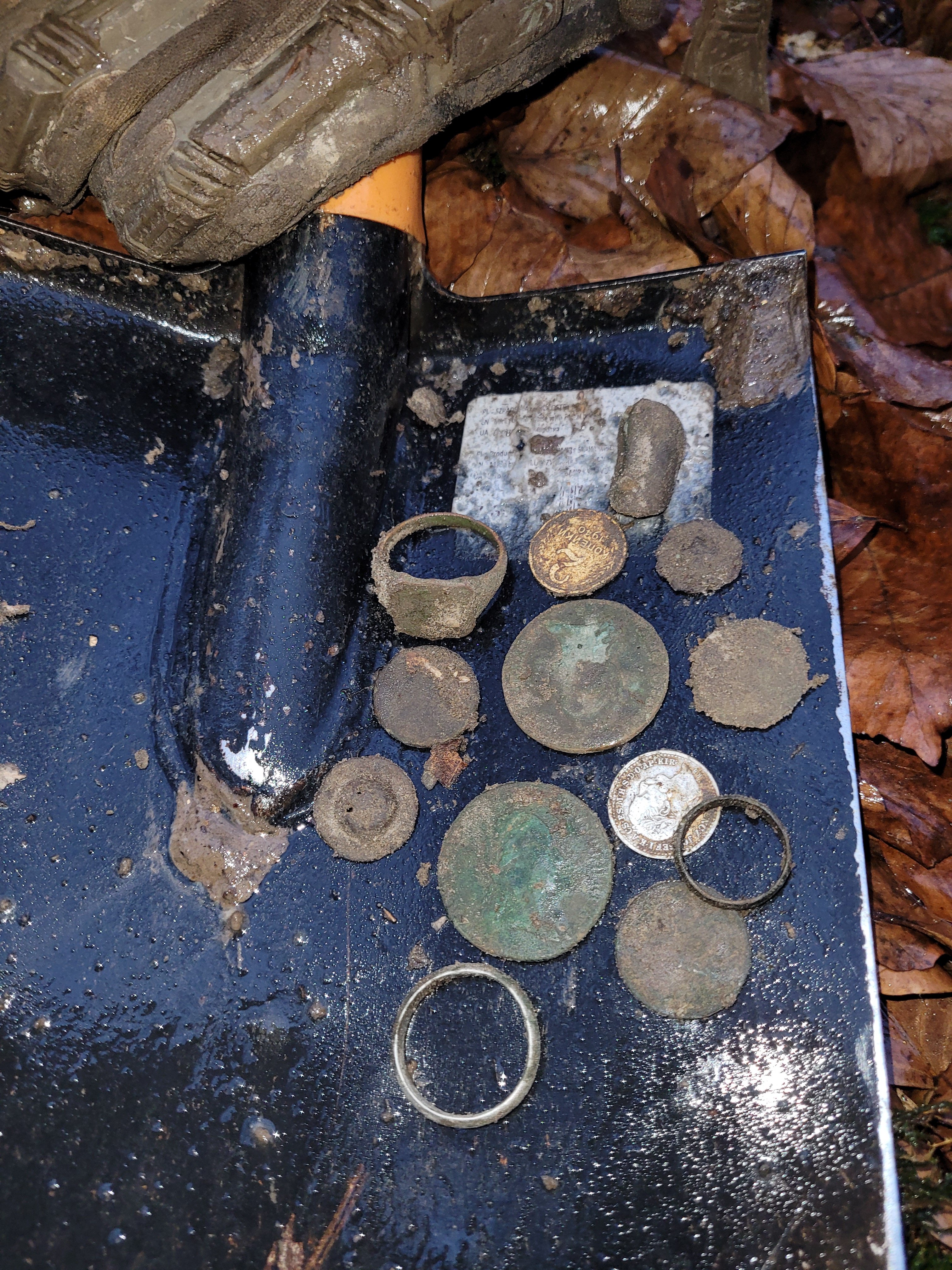 Вітаю. 20221119_113800.jpg 20221119_113844.jpg 20221116_161720.jpg Почувався, як Володар Каблучок). Йшов по лісу, та закопував вирви попередника. Не знаю, що він шукав, але ось що лишилося, ділянка десь 10 на 20 вздовж дороги. Перший раз два сігнала поспіль обручки. Срібна норм, хіба клейма відсутні, проте агресивний грунт з'їв залишки жовтого металу з персня, та зробив визерунки невиразними.