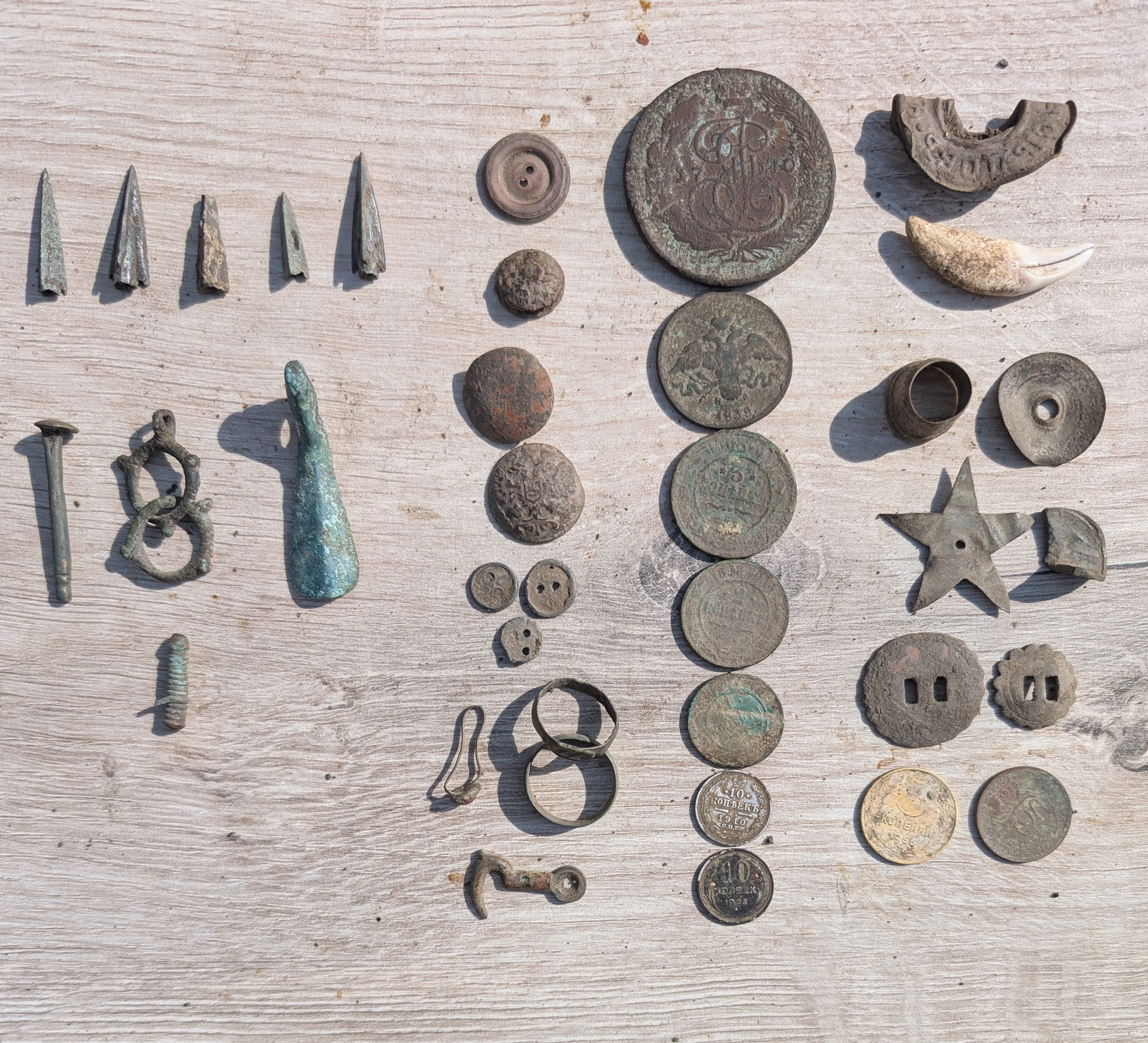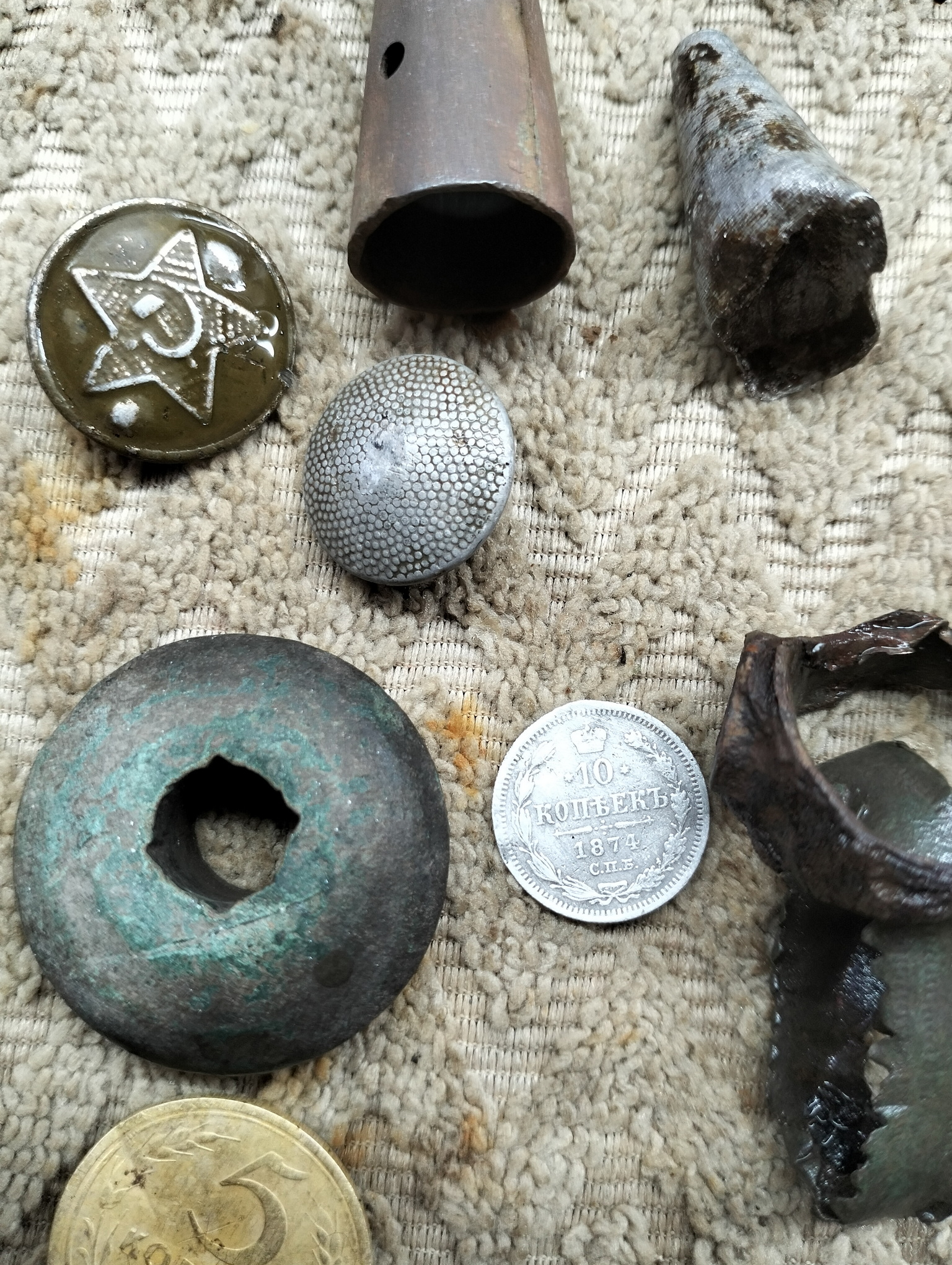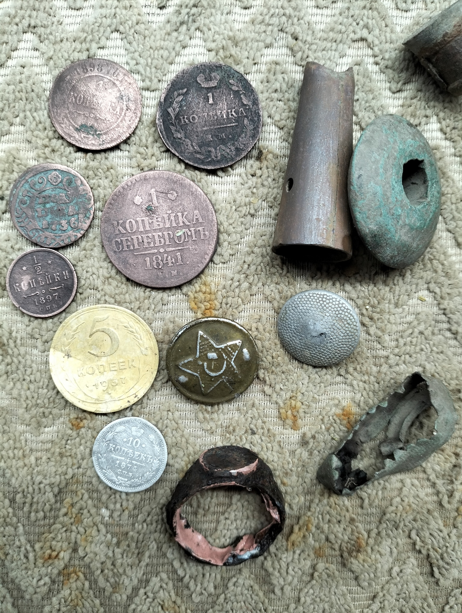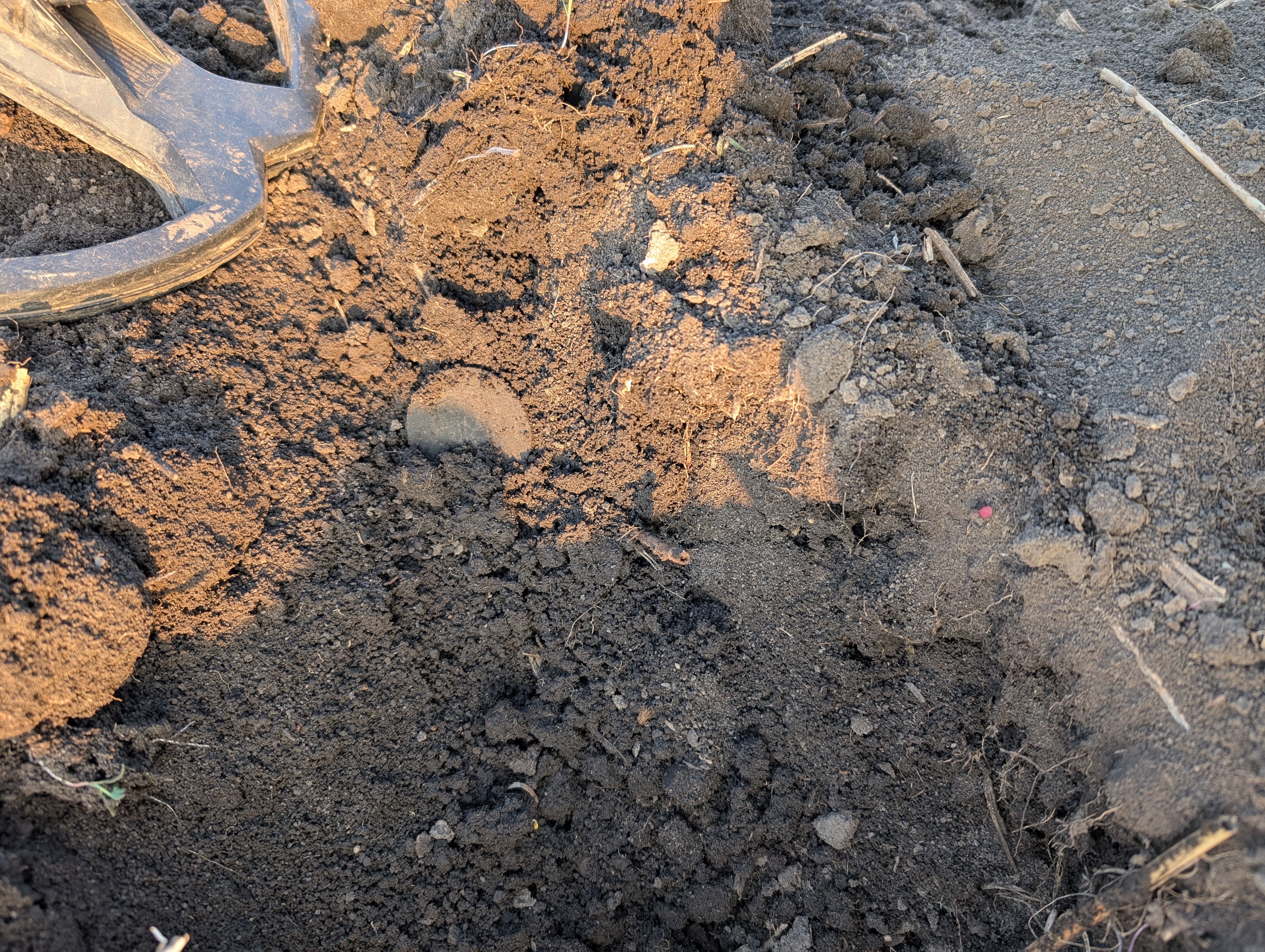 Вітаю, поки не заліз в чергові іпеня, вийшов з приладом. другий раз ходжу по слідах якогось типа, що лишає ями та шмурдь, петляючи й тягне лопату. Декілька монет тупо в слідах. Але й фарт присутній. Хоча я не знаю, що він знайшов, можливо для нього це шмурдь.