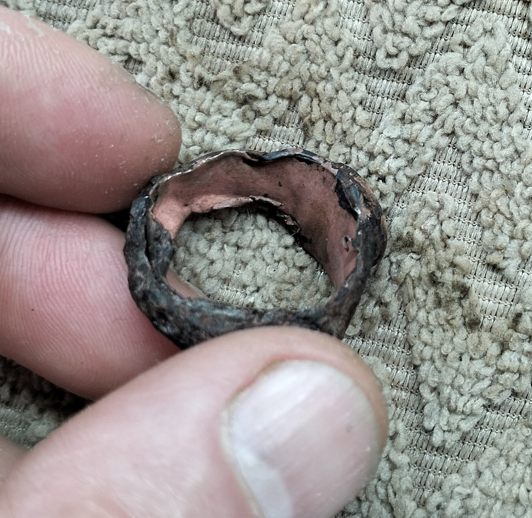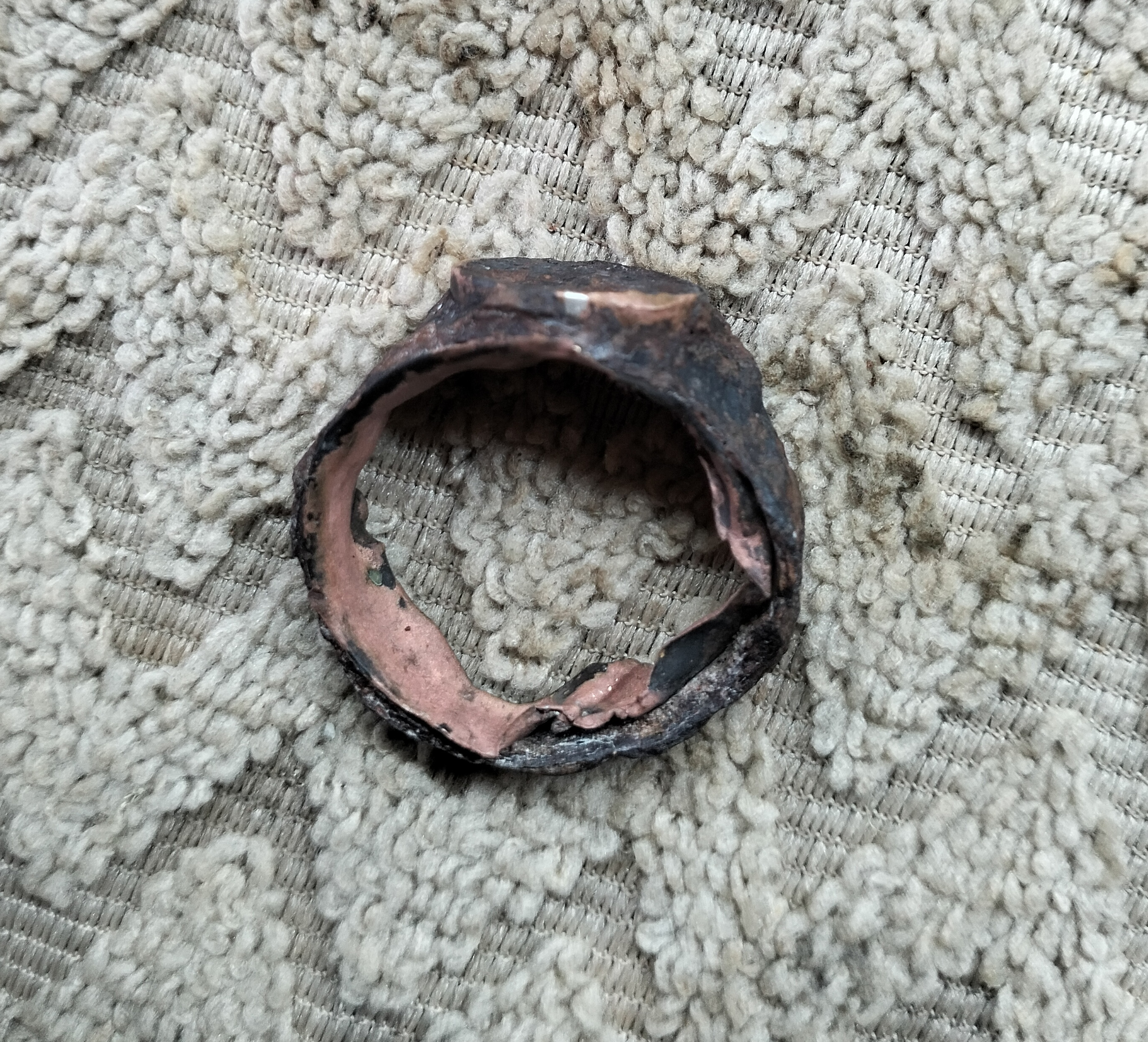 Приветствую всех! А я эти выходные по полдня в лес и на поле. Душу отвел, накопался цветмета )) Из найденного две непонятки. Бронзовый ролик - по форме ну точно прясло. В хорошей патине, явно пару сотен лет ему. Но в отверстии с одной стороны небольшие насечки, будто насаживался на что-то. Что оно может быть? И перстень чудной. Корпус стальной, магнитится. Низ, где под палец и верхняя шайба, где камень - медь. Немного подержал в лимонке, медь сразу покраснела, проявилась. Встречались кому такие?