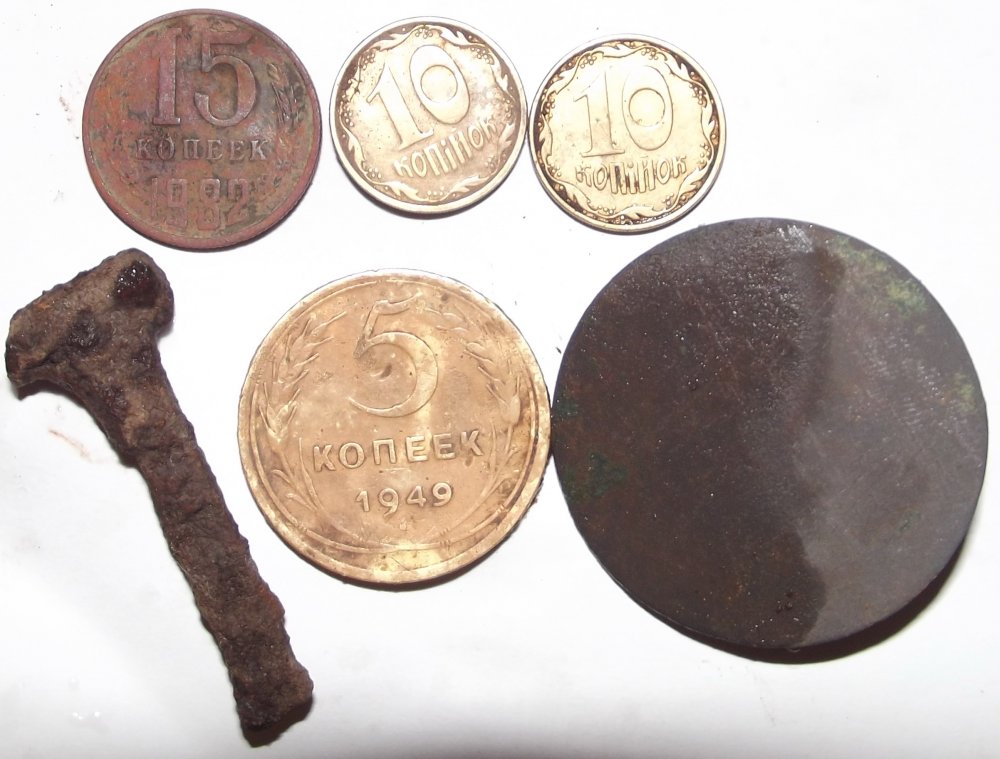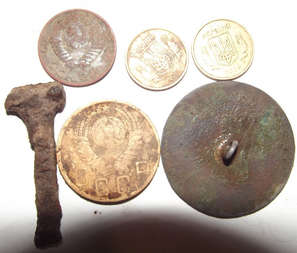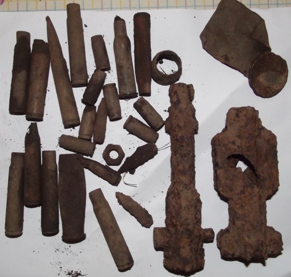 был сегодня на копе - решил копнуть хутор в надежде что он нетронут, но приехав на место увидел стоявшую в кустах ниву и свежие ямки не подалеку судя по всему комрадов было как минимум две так как одни ямки закопаны, а вторая половина нет, и вместо старины прошелся по ганс позициям. углубившись в лес иногда поражался наличию по среди леса водочно-пивных пробок, и сколько пить можно ))) вылезла пуговка больших размеров и непонятная хрень в виде молотка также мой товарищ нашел шомпол от моси и топор. какой то комрад до меня вырыл яму по колено на дне которой лежал снаряд 76-80мм без взрыввателя