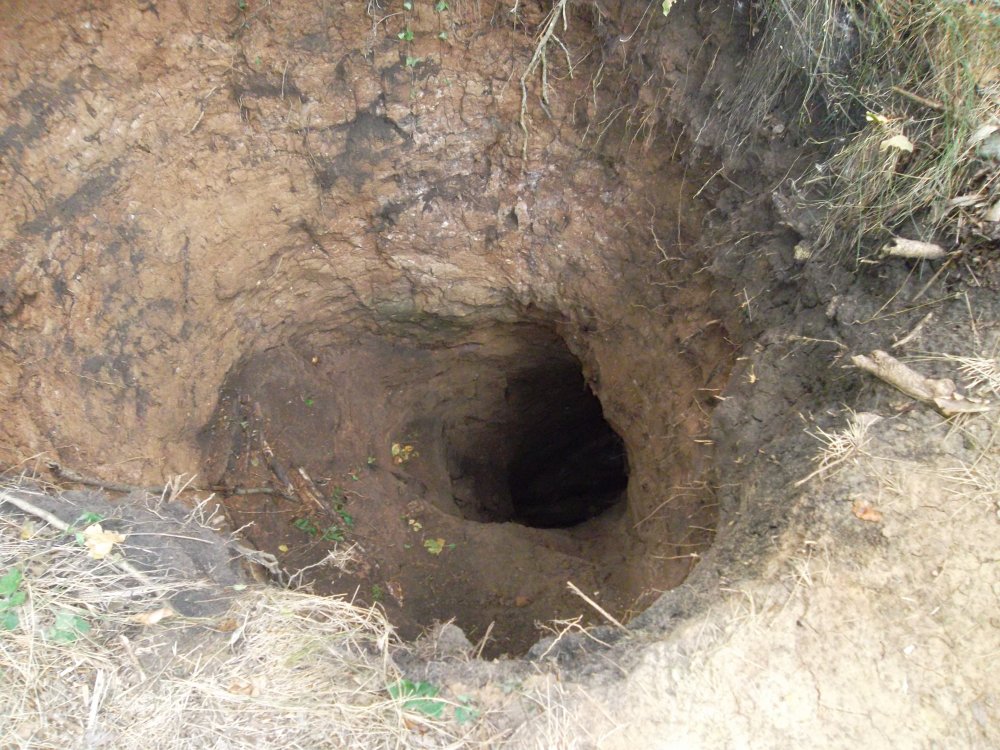 Всё просто: байрачный лес, из одной стороны оврага выходят две параллельные траншеи на расстоянии метров 40-50 друг от друга. В 80-е годы открылся лаз по бугор из нижней траншеи, а там гансовский оружейный склад-местные нормально подлатались, а всё остальное вывезли и вход взорвали. В прошлом году он снова открылся. Кто-то, по моему, решил, что вторая траншея тоже ведёт в склад. Отступили от места, где траншея "входит" в склон метров 15 и начали долбить колодец-это сугубо мои предположения.