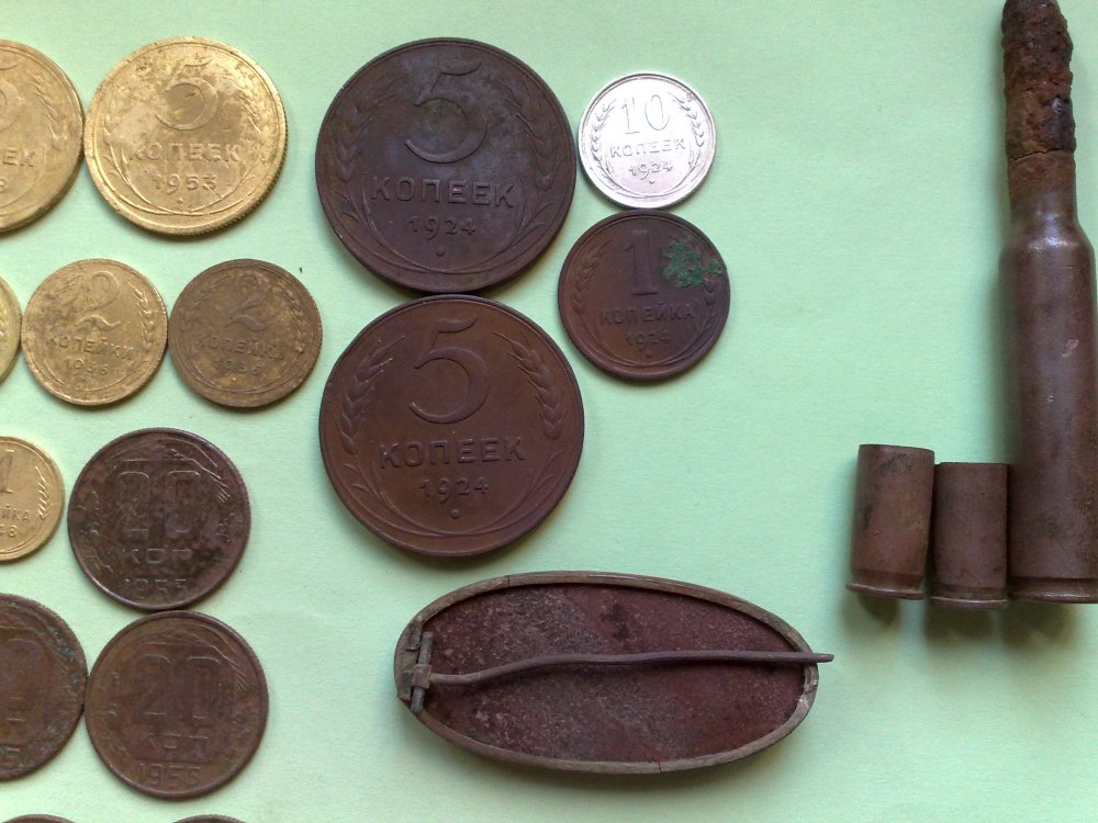 Сегодня вырвался копнуть. Из монет два билончика 10 и 15 копеек, такую пару нахожу второй раз. Шлем трехклеп. Подскажите что за зацепы?