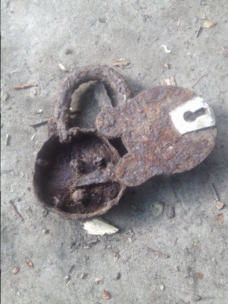 Вчерашний выезд. Найден замок хотелось бы специалиста услышать насколько интересная находка? А так же какая то железяка 40 см в высоту и в поперечнике внизу 15-20 вверху 20-25 и походу кажется немного раскоепанным. Весит килограммов 40 (еле дотащил до машины 1,5 км :) )