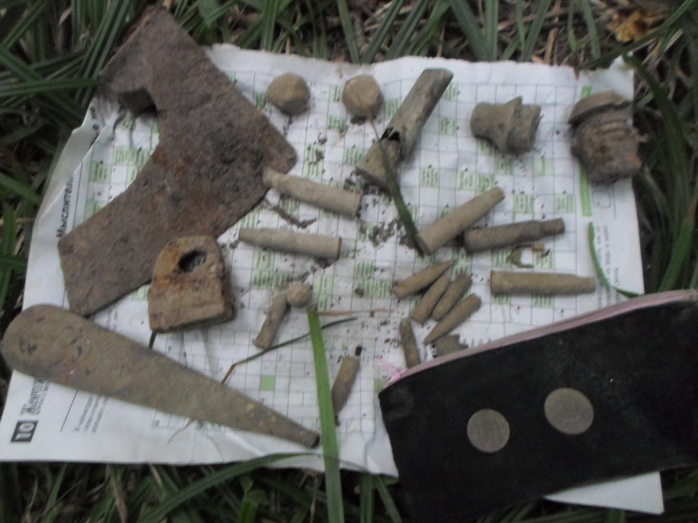 После взобрался на хребет.Там до сих пор возле траншей выложенные из камня бойницы стоят...хотя их разрушить одним движением руки-просто камень на камень положен.Фото нет ибо попал под дождь и туман на высоте 2016 метров и чуть не канул в неизвестность сбившись с маршрута и потопав в Румынию...))))На обратном сутки висел в хотинском лесу(Черновцы).Отдыхали ноги моей спутницы)))Под вечер решил пробижаться...и первые 5 минут копа меня поразили...Вылез древний топор...так понял боевой...Потом нижняя часть ножен резная(помою еще),картечи,пуль дореволюционных мосинских....ну и два ранних совета(ото я ездил на запад за ними!!!)...После этого леса застопил копателя на трассе...Я ему:"Вот такой то лес,там то,куча всего и не копано.Вы че,вообще уже?Пару часов побегал и вот что.А если бы на денек?"....А он мне:" Ты знаешь,у нас тут крепости всякие,места,мы и на них копаем,там сосредоточено всякое...А эти твои леса с топорами и ВОЗМОЖНО еще с чем то нам до сраки тут...Я в шоке! Зажрались