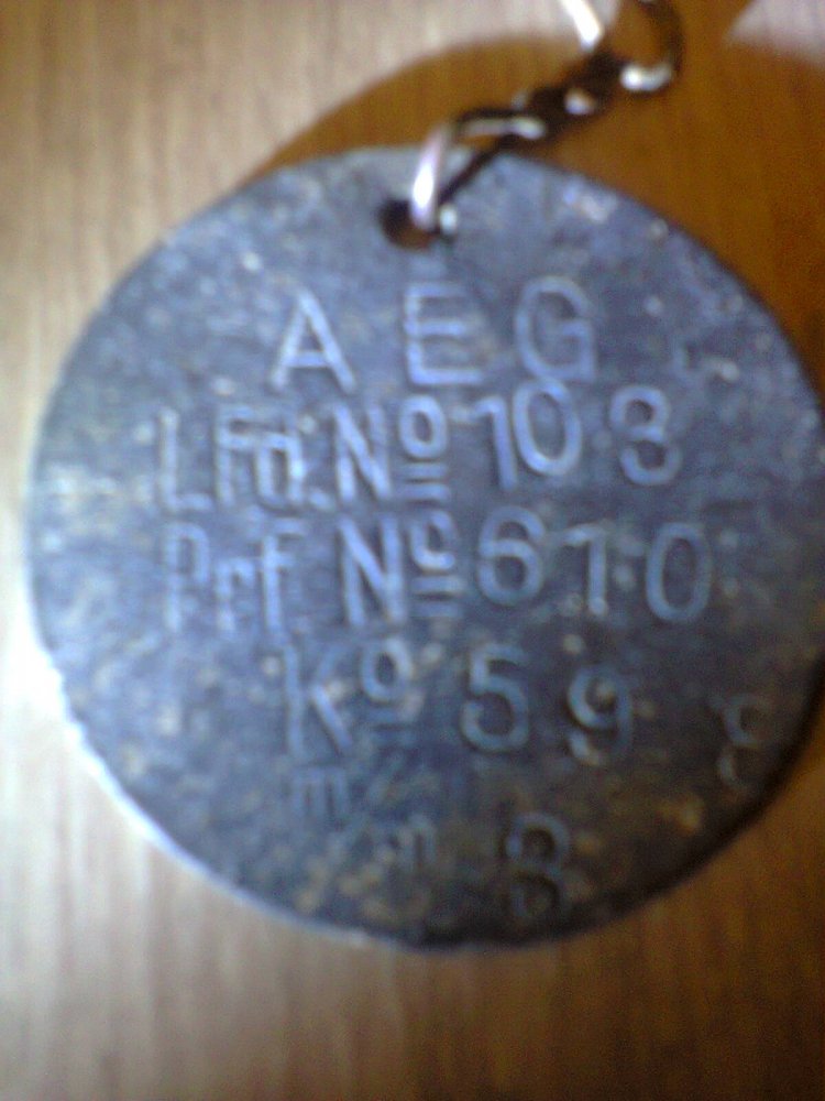Гугл говорит что скорее всего бирка от какого то оружия времен ПМВ. AEG (нем. Allgemeine Elektricitäts Gesellschaft — англ. General Electric Company — рус. Всеобщая электрическая компания) Нужно гадать что за сокращения, тогда можно понять от чего бирка. Последняя строчка м/м может означать милиметры у той же проволоки. ИМХО