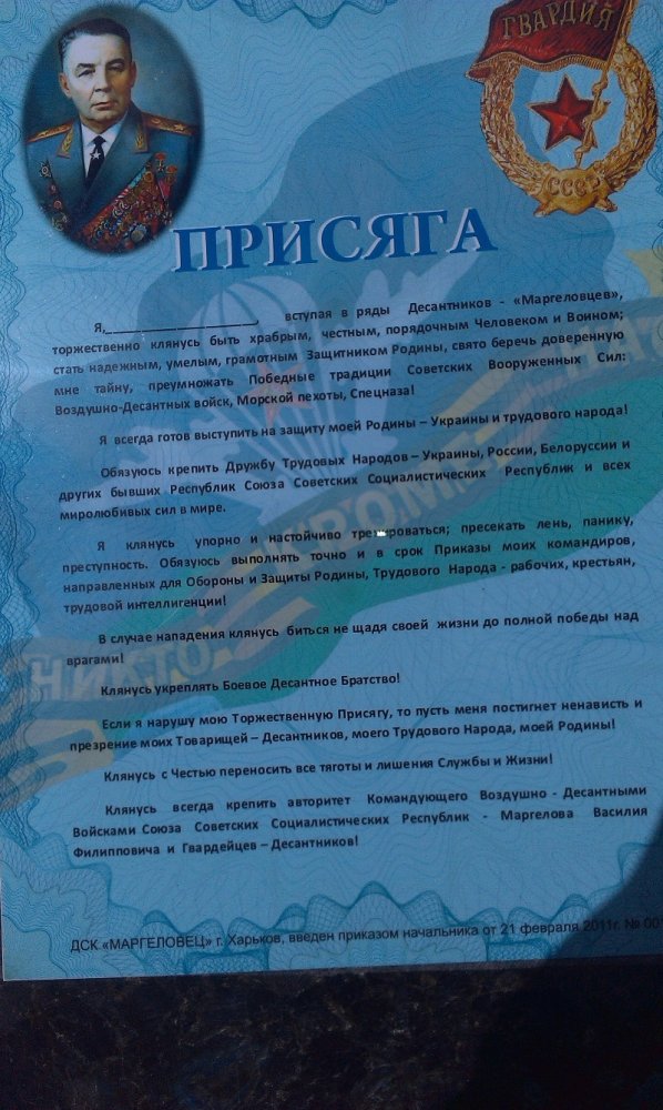 Вот под личиной слобожанского козачества скрываются вовсе не черные археологи, а Харьковский десантно-спортивный клуб «Маргеловец», являющийся филиалом Чугуевского общественного центра «Вымпел». И их там далеко не пять человек, даже если половина сейчас на Донбассе, там еще есть кого брать. Вот их присяга: