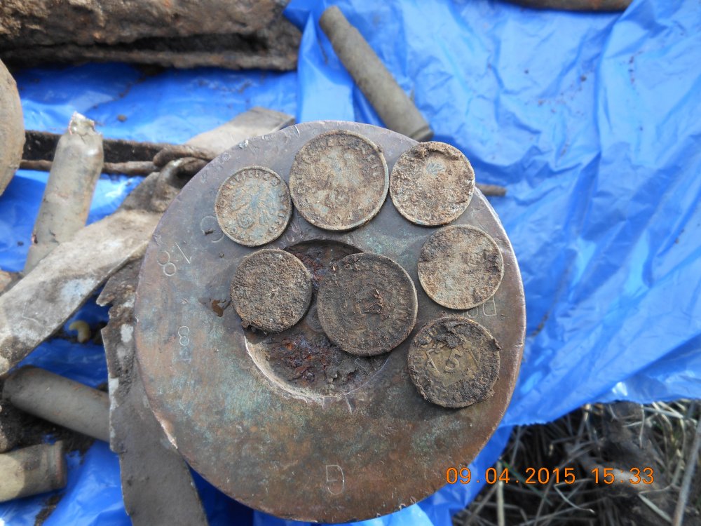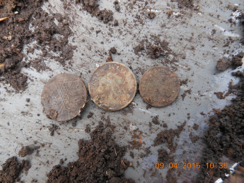 Сегодня покапался,монеты были в одном месте ,еще были остатки кошелька,в патине зубило ,тоже возле позиций было.