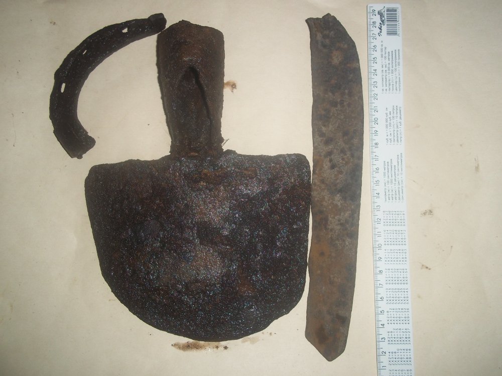 Доброй ночи. вот и мне наконецто сегодня удалось покопать, несколько дней шел дождь. улыбнула пряга думал серебро перевернул а там цена 12 коп. но порадовало железо дед подарил кованый фрискарик и непонятный нож кованый огромный. подскажите что за буквы на пуге?