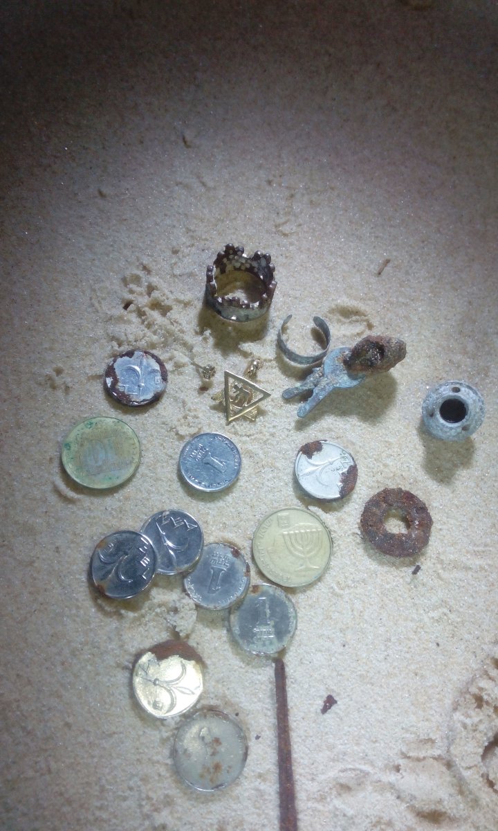 Сегодня часок по пляжу походили.Погодка супер,только прибор начал глючить-меньше пробок что-либо перестал видеть(уже разобрался--окислилась пайка на катухе). Рыжики были найдены женой брата визуально -прибор никак не отреагировал. Прикольнул бронзовый перстень в виде короны.Весь корявый-может старый,а мож и современная хрень.