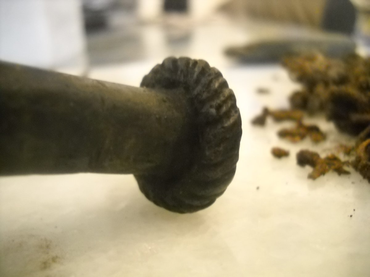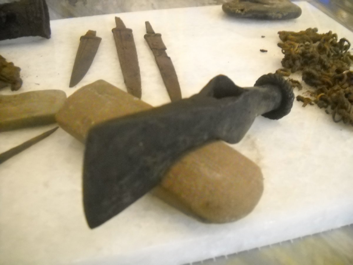 Был на месте подъёма комплекса.Итог - обломок ещё одного оселка,непонятный камень и фрагменты кольчуги. С топором интуиция не подвела,после поверхностной расчистки проявился рельеф на обушке.Повозившись некоторое время получил такой результат.