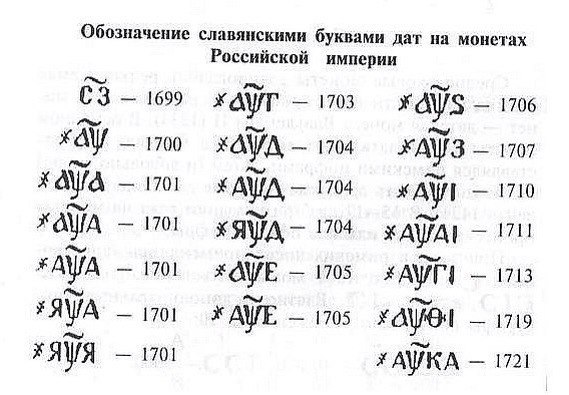 Благодарю за сылку я ее смотрел и еще смотрел http://www.a-saida.jp/spravki/silver-copeck/215.htm http://www.m-dv.ru/monety-rossii-1700-1917/kid,7/mid,4/nid,37/types.html http://www.m-dv.ru/monety-rossii-1700-1917/kid,7/mid,4/nid,37/types.html http://www.russian-money.ru/(S(4om1...oins.aspx?id=44&AspxAutoDetectCookieSupport=1 но таблицу годов не нашел Спасибо, я методом подбора и пересмотра тоже на 1705 год вышел. Я имел в виду что не нашел таблицу какие буквы какой год обозначают. А вообще копаю обычно так: хожу по старине, а копается по войне