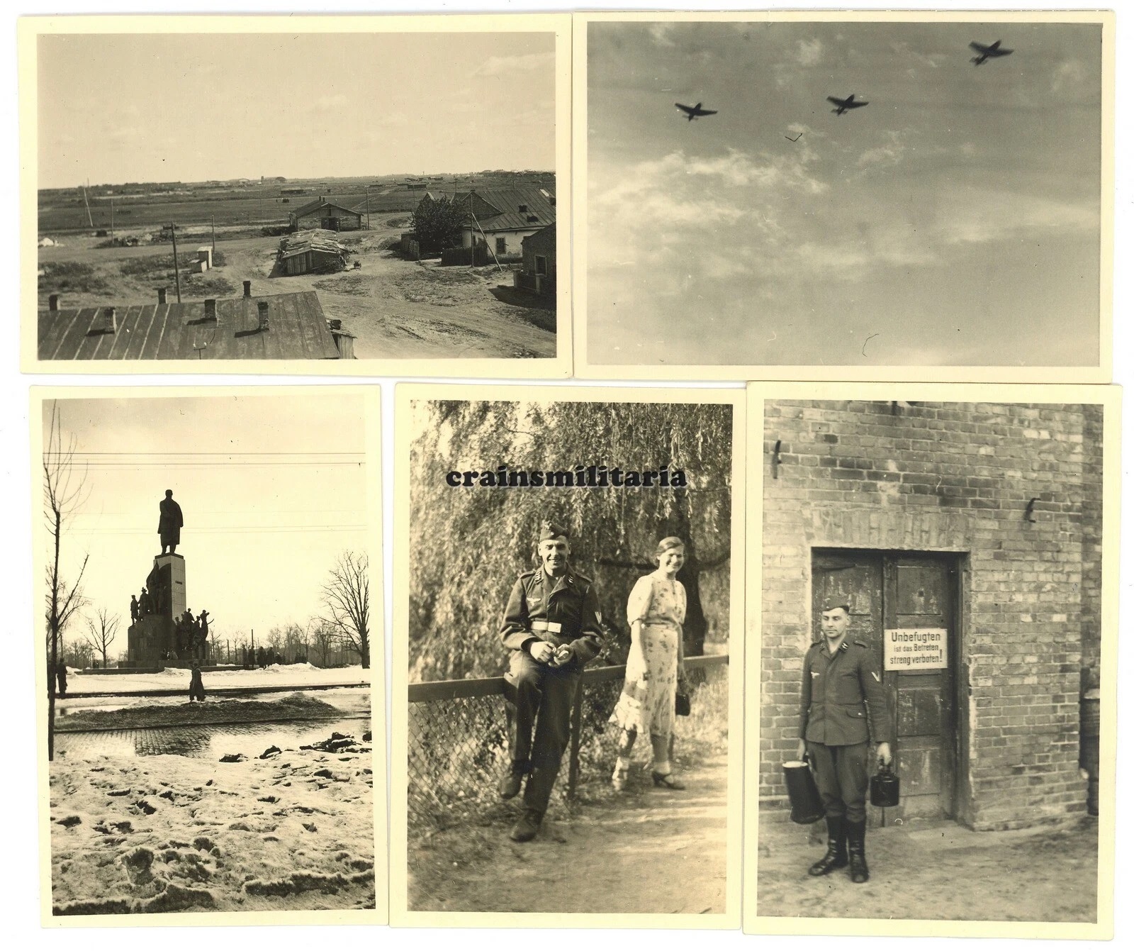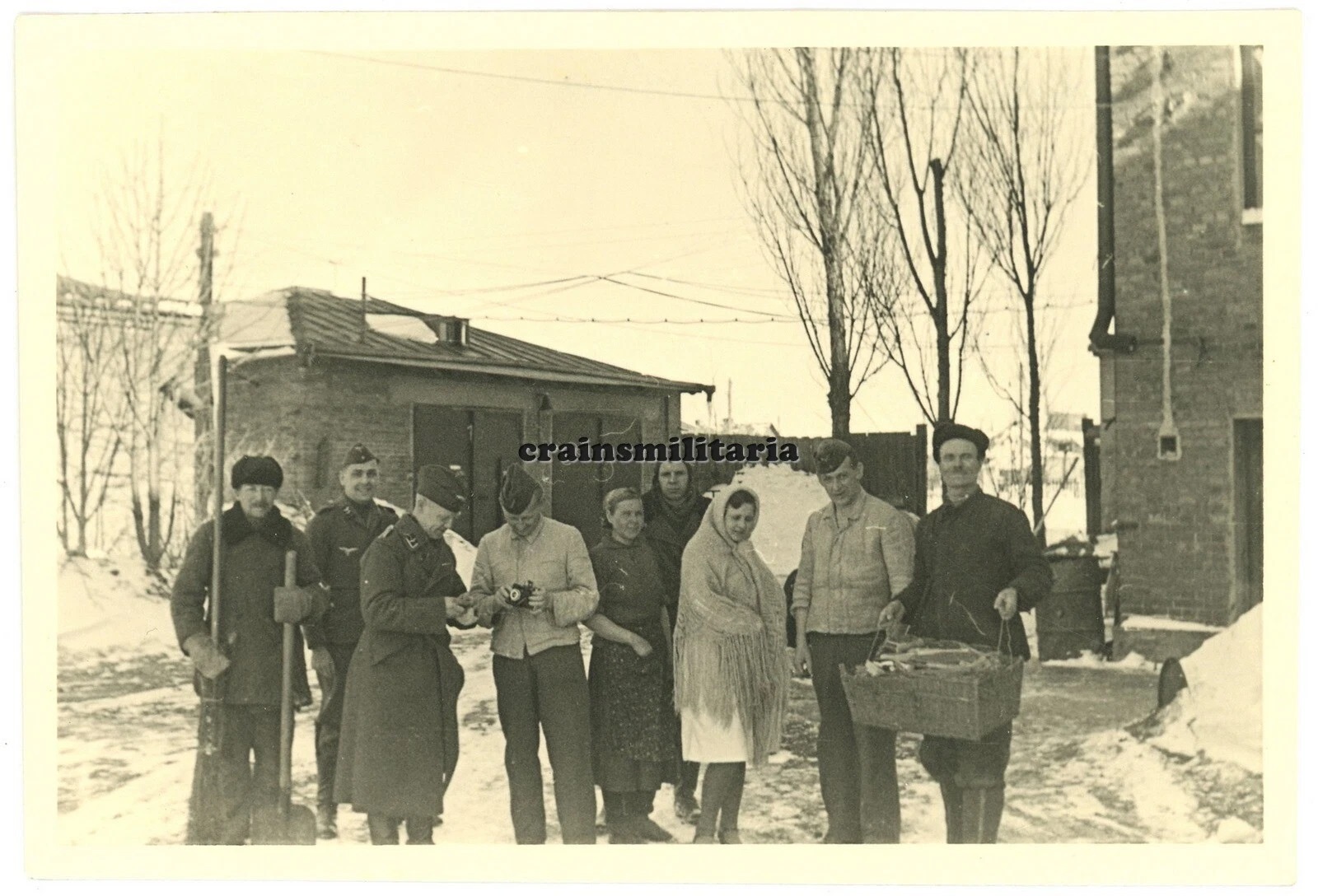 Aus dem Nachlass der Veteran der Luftwaffe Heinrich Cäsar aus Wolfenhausen (Weilmünster). In 1940 diente er als Besatzungstruppe in Polen, Anfang 1941 in Frankreich (Valenciennes). Ab April 1941 mit Fliegerhorst-Kommandantur E 17/XII am Flugplätze Mielec und Labunie, Polen. Ab Sommer 1941 am Südabschnitt der Ostfront mit der Stab des Luftwaffen-Bau-Bataillon 2/VIII. Mit dieser Einheit wurde er ua lang am Flugplatz Charkow (Ukraine) eingesetzt. Ende 1943 nach Italien; hier in 1944 Umbenennung des Btl. in Luftwaffen-Pionier-Bataillon 6. ---------------------------------- 1) "beim Postholen mit Müller in Charkow". Soldaten in Schnee Strasse bei Flugplatz in Charkow, Ukraine, ca. 1942-'43 2) "Auf dem Wege zum Theater, Charkow, März 1942". Soldaten mit Panzersperre an Theater in Charkow, Ukraine, 1942 3) "Ein Ständchen, Unser Quartier, Kdo. Flug. Charkow 1942". Konzert an Kommandogebäude des Flughafenbereich in Charkow, Ukraine, 1942 4) Strassenszene bei zerstörtes Rathaus in Charkow, Ukraine, ca. 1942 5) Strassenszene bei Roter Platz in Charkow, Ukraine, 1942 6) "Der rote Platz in Charkow, 1942" und später mit Kugelschreiber "Hptm. Ridder mit Wagen" 7) Strassenszene bei Roter Platz in Charkow, Ukraine, 1942 8) Soldaten mit Pkw an Roter Platz in Charkow, Ukraine, 1942 9) Soldaten am Roter Platz in Charkow, Ukraine, 1942 10) Soldaten mit Bevölkerung bei Markt in Charkow, Ukraine, 1941 11) Panorama des zerstörtes Bahnhof in Charkow, Ukraine, 1942-'43 12) Strassenszene an zerstörtes Bahnhof in Charkow, Ukraine, 1942-'43 13) Panorama zerstörtes Bahnhof in Charkow, Ukraine, 1943 14) Bevölkerung bei Strassenbau an d. Kohleninstitut in Charkow, Ukraine, 1942 15) Frauen bei Markt in Charkow, Ukraine, 1942 16) Frauen bei Markt in Charkow, Ukraine, 1941 17) Soldaten bei Museum mit Denkmal in Charkow, Ukraine, 1942 18) "Frauen beim Brennholzmachen, Charkow 1942". Ukrainische Frauen bei Arbeit an Schule in Charkow, Ukraine, 1942 19-20) Soldaten und Bevölkerung bei Strassenbau an d. Kohleninstitut in Charkow, Ukraine, 1942 21) Frauen bei Markt in Charkow, Ukraine, 1942 22) Frauen an Lopan Ufer in Charkow, Ukraine, ca. 1942 23) "Beim Blumenkaufen, Charkow August 1942" 24) Bevölkerung bei Gottesdienst in orthodxoe Kirche in Charkow, Ukraine, ca. 1942 25) Soldaten in Charkow, Ukraine, Ende 1941 bis Anfang 1943, ua mit Bevölkerung, Quartier im Kohleninstitut, Stadtteil Datscha Raschke usw 26) Bevölkerung an Lopan Brücke in Charkow, Ukraine, ca. 1942 27) Strassenszene an zerstörtes Rathaus in Charkow, Ukraine, 1942 28) "Überschwemmte Strasse in Schuralowka(?), Charkow, Mai 1942" 29) Soldaten in Charkow, Ukraine, Ende 1941 bis Anfang 1943, ua mit Bevölkerung, Quartier in Pomerki und im Kohleninstitut 30) Soldaten in Charkow, Ukraine, Ende 1941 bis Anfang 1943, ua mit Bevölkerung, "Villa Timoschenko/Pomerki", Danilowka, usw