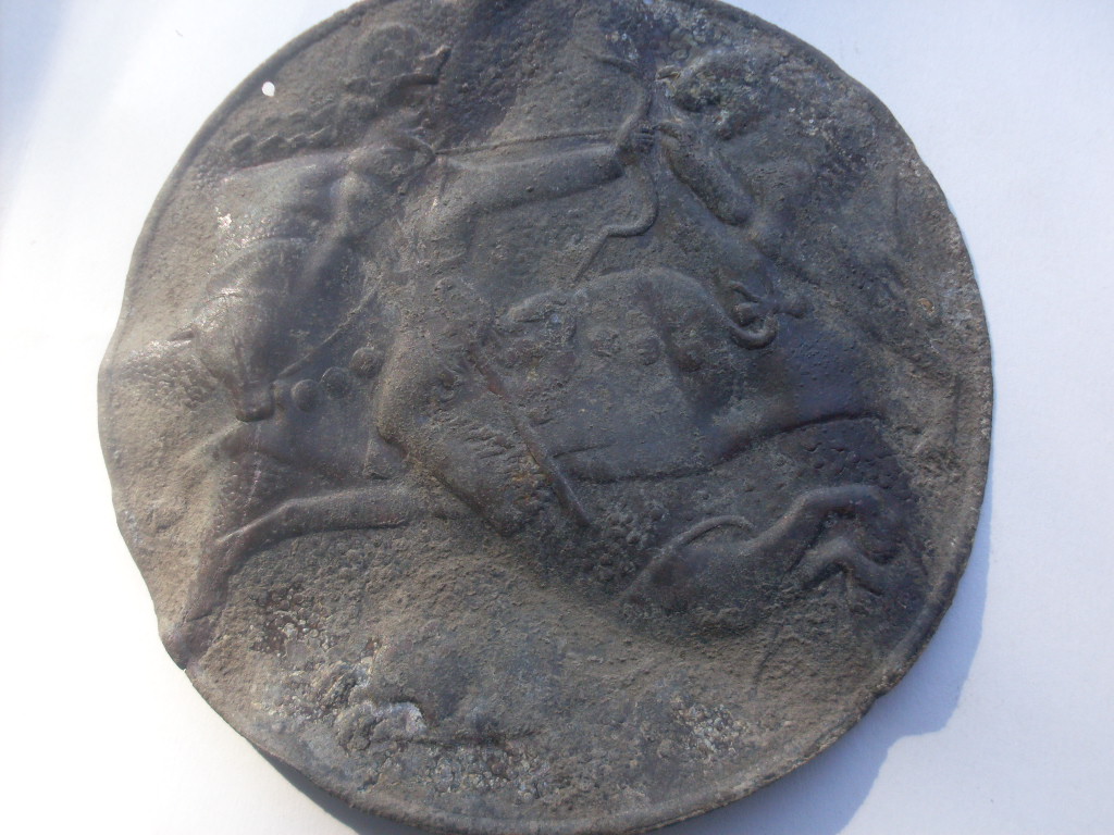 Добрый день , подскажите по находке . Всадник скачущий на лошади с натянутым луком назад под ногами убитый лев сзади лев стоит на задних лапах , всадник с бородой и мечом на левом боку , найдено на поле где были находки по скифам или хазарам. сорентируйте пожалуйста с УВ