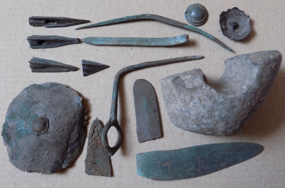Да жара выгнала с поля - что успел накопать с четырех до одиннадцати, вроде бы все проутюжил, после предшественников одни обломки древности только и попадаются... Жалко каменного молотка - по размеру обломка наверное была кувалда, и два наконечника не заточены - видно успели потерять сразу после плавки.