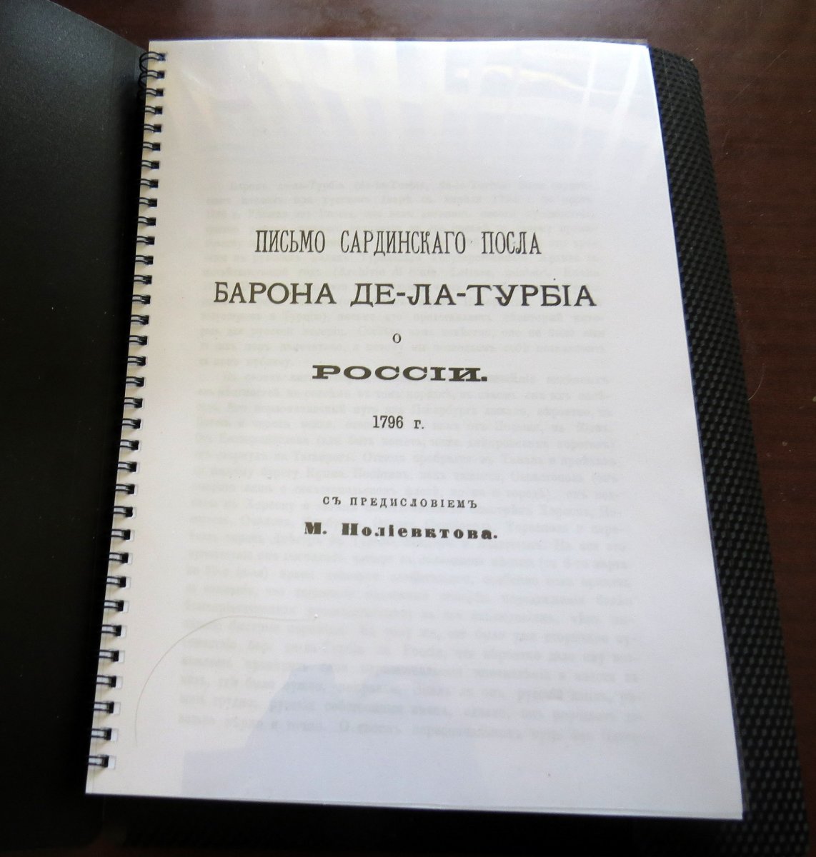 Нашел в ВК ПИСЬМО САРДИНСКОГО ПОСЛА, БАРОНА ДЕ-ЛА-ТУРБИА О РОССИИ 1796 г. Полный текст письма на французском и русском языках,перед изданием факсимиле передан в военно-исторический музей им. А.В. Суворова г Очаков. Представляю Вам отрывок о городах Се́верного Причерномо́рья (Херсон,Николаев, Очаков, Одесса)и крепости Кинбурн. <...> В Херсоне — земляная крепость, которую, правда, увеличили после моего первого путешествия, но которую все же можно причислить только к числу окопов. Дурной воздух, трудность доставления грузов, что заставляет купцов держать магазины в Глубоке (Gloubok), и новые города, которые были построены позднее, низводят число жителей Херсона до 6.000. Императрица только что подписала указ о производстве работ на порогах Борисфена; будут устроены шлюзы и другие сооружения, что может облегчить плавание по низовьям этой реки и быть может привлечет сюда торговлю из других местностей. Но чтобы судить об этом, надо ждать, пока работы будут окончены. В Херсоне постоянная верфь, где строят линейные корабли, которые затем идут в Севастополь: до Лимана их тащут с помощью верблюдов. Николаев, построенный князем Потемкиным в память взятия Очакова (Oksakoff), расположен при впадении Ингула в Буг, в 67 верстах от Очакова. Город — восхитительный, прекрасно построен, весь из камня. Он заселен жителями из Херсона, как Херсон был заселен жителями из Елизаветграда (Elisabeth) и Нежина (Nijen). Здесь находится адмиралтейство Черного моря и живет начальник этого адмиралтейства адмирал Мордвинов. Здесь также cтpoят линейные корабли и другие суда. Население Николаева уже уменьшилось до трех или четырех тысяч: оно переселяется в Одессу. Здесь xopoший климат; вода в Ингуле годна для питья, воды Буга на этом расстоянии от Лимана еще солоны....