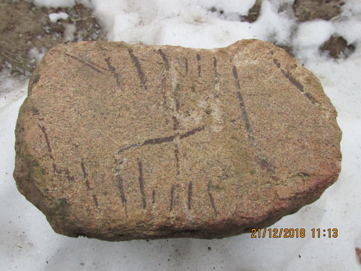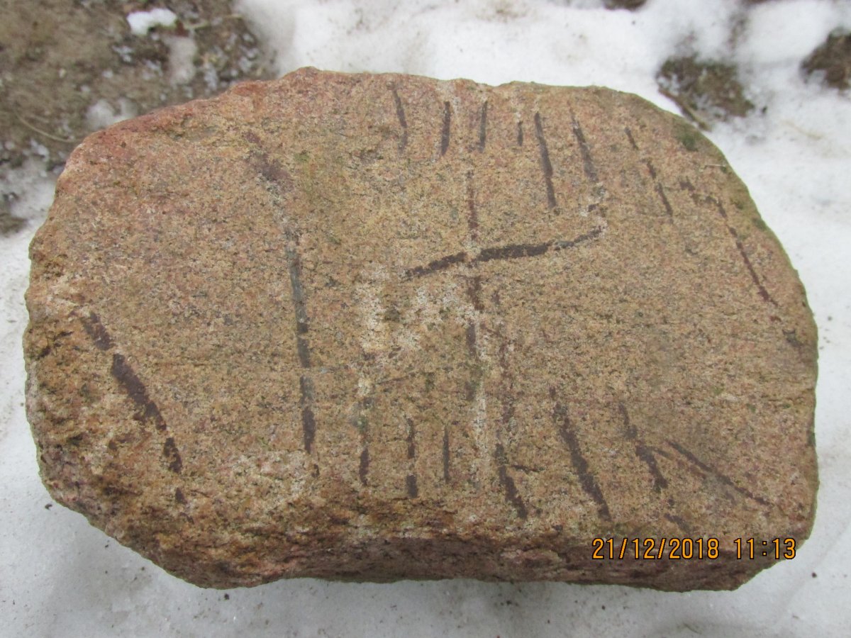 Это точно, вот на фото кусок подобной с "графити" желтым (ржавчина) и белыми царапинами от плуга. Этот разбитый и имеет выработку от терочников, а целый длиной более 40см уже давно сдал в местный музей - фото не делал.