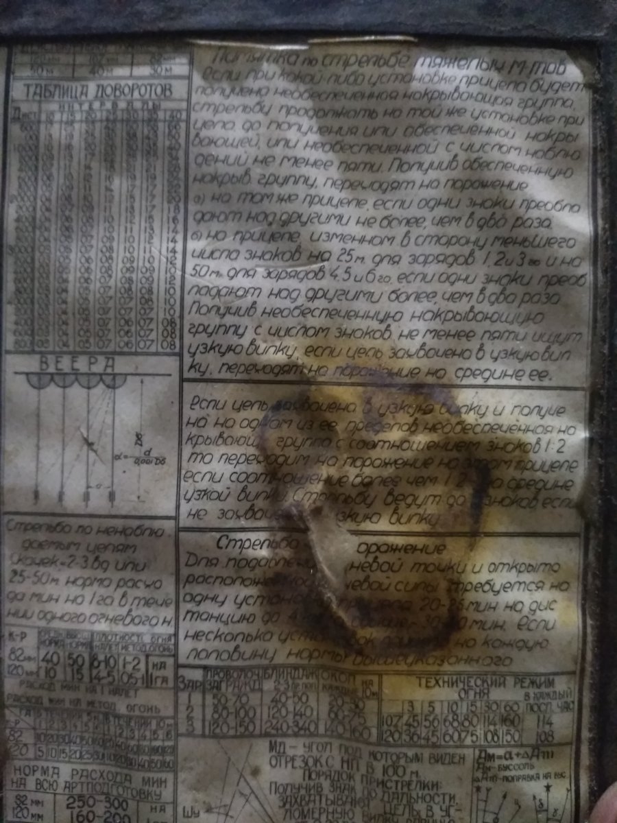 В тетрадях по боевой подобные таблицы - инструкции у отца встречал,летчика.Только уже перефотографировано,в виде отдельных фото -наверно как подсказка,памятка для летчиков и штурманов еще с тех времен.-Таблицы по бомбометанию,ориентиры на местности поправки "по сапогу" и т.д. У тебя, как я понял для минометных расчетов, если вся электроника ёкнет, чтоб помнил дедовский метод