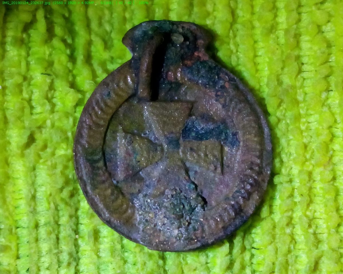 Всем доброй ночи. Сегодня под дождиком в лесу прогулялся.Не чего интересного,убитых советов пару.А вот в камышах выпал вот такой "значек" Подскажите ,что это может быть?? -похоже на знак в петличку.. (?)