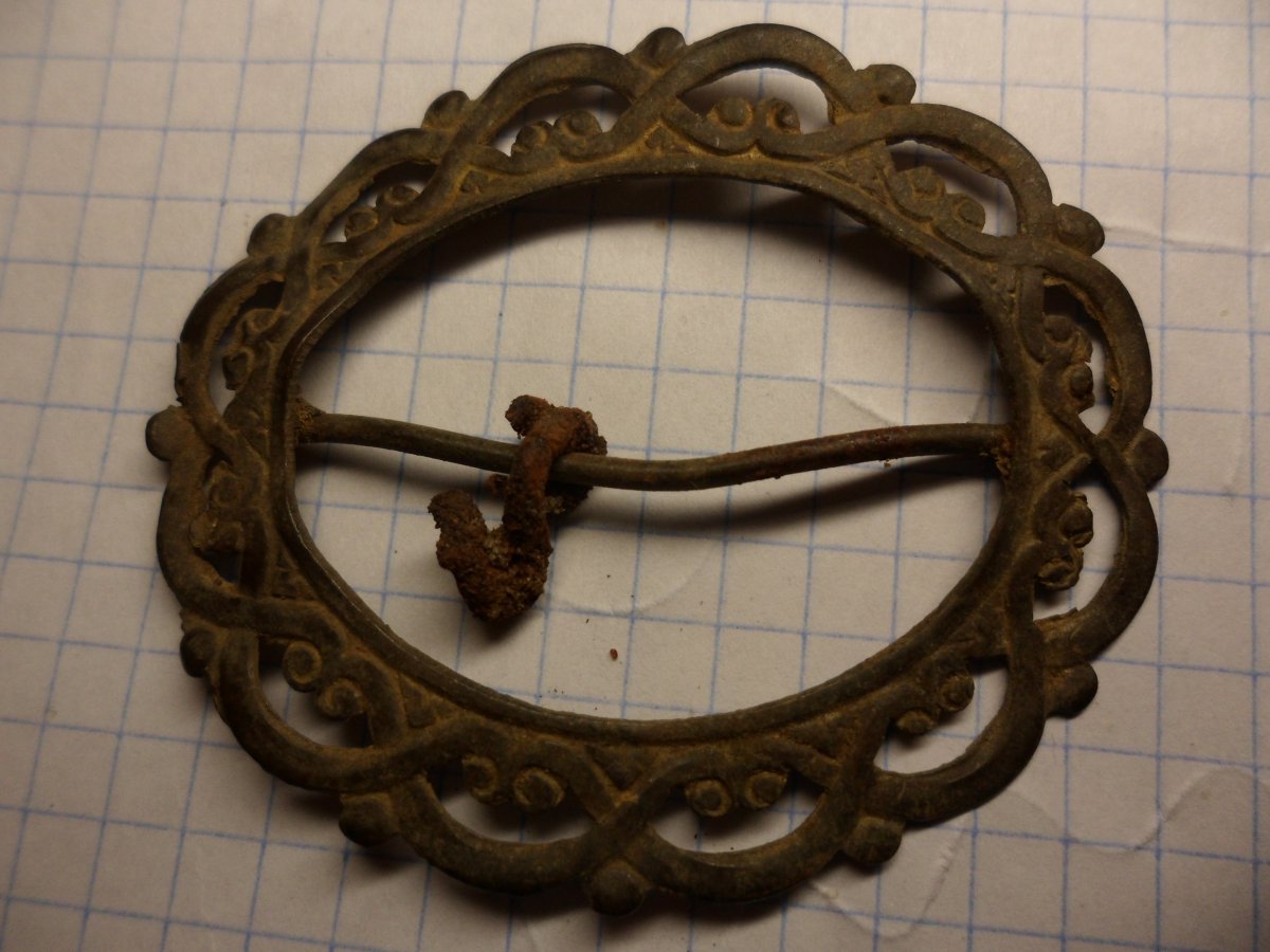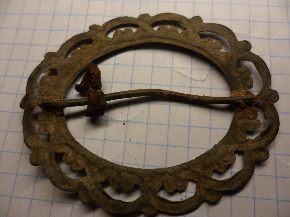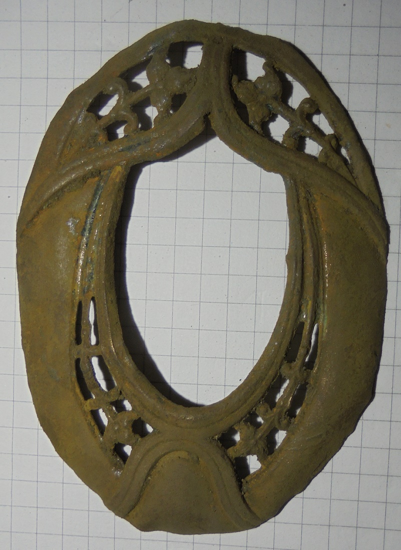 Та обратка там звичайна , штамповка , було дві голки зверху вниз , як я думаю кудись наколювати можливо на одяг а по середині зверху вниз ну ніби тримач який утримував те що мусило бути посередині , поклав до кишені коли відкопав і ті голки і тримач повідпадали. Бронза або латунь ХЕЗ .