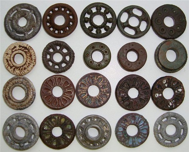 Частая находка у нас. Прясло "колесо". В отличии от классических конусообразных прясел эти имеют в своём составе, очень часто, солярные символы в виде отверстий и рисунков. Второй и третий ряд - первые по счёту, похожие на найденный сегодня.