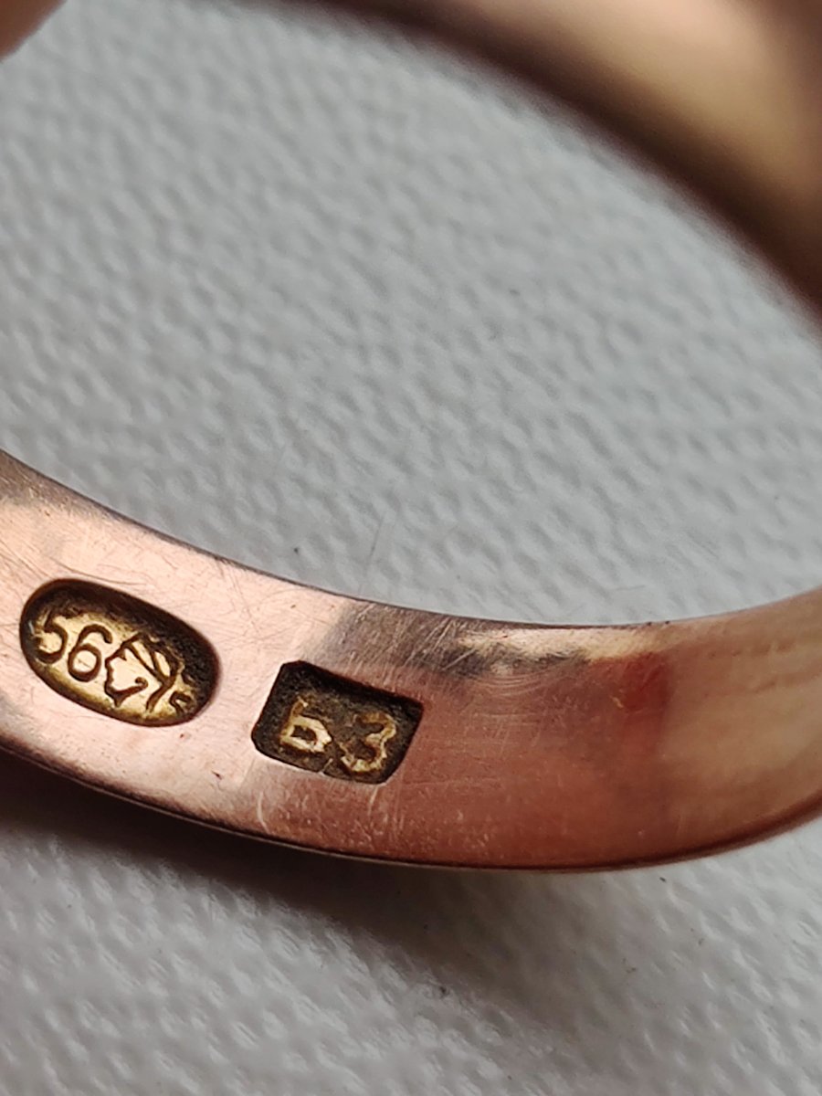 Мои поздравления,проба "царская" но видно ,что "металл" в районе клейм желтый (так и должно быть),а наружная поверхность кольца имеет красноватый оттенок ,как у пробного золота Советского периода.