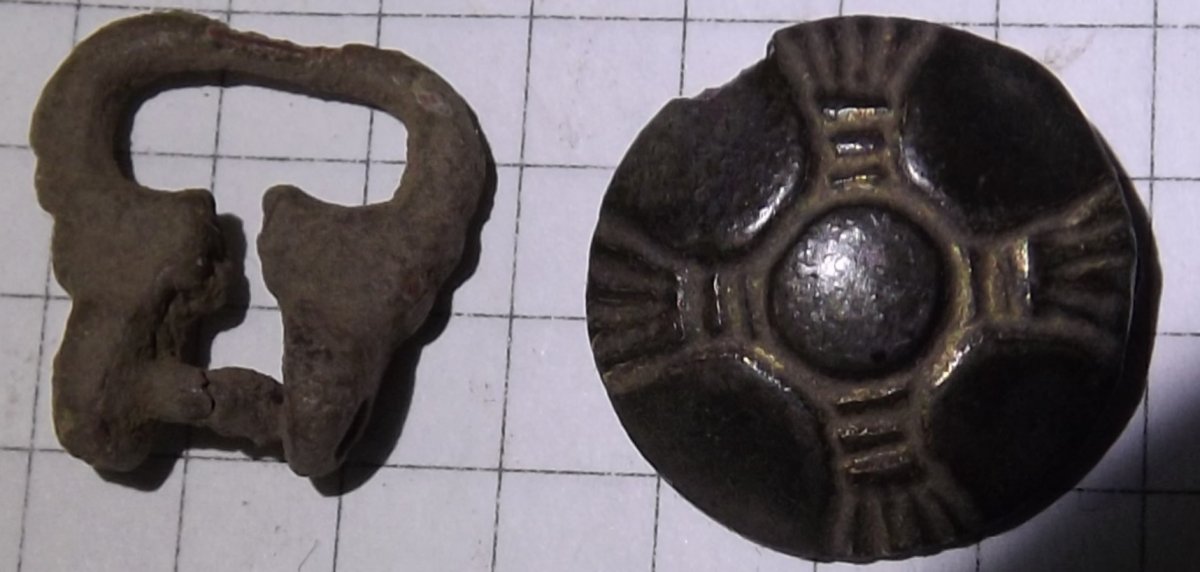 То что похоже на монету, корабельный жетон или еще называют платежный жетон, а накладка похожа на глаз грифона, но способ крипления по моему мнению средневековье.
