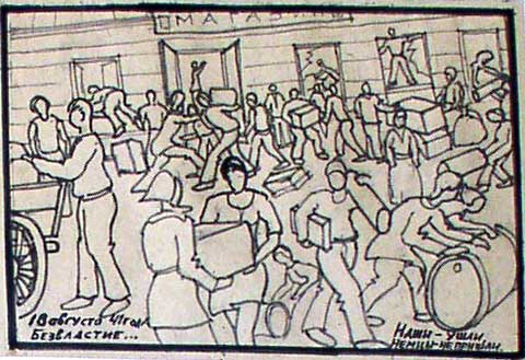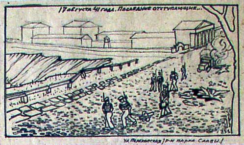 Бааяян.На второй, кстати-тот самый госпиталь с которого кладбище и турма.И кусочок Арестанской ,ныне засыпаной балки.Вроде бы все достоверно, но вот только что закралось некое сомнение...Внизу еще одна подпись-"ул.Перекопская,РАЙОН ПАРКА СЛАВЫ".Эти рисунки всегда позиционировались,как именно военные,тех времен.Ну или я считал, что за неимением фотоаппарата, человек прям сей секунд зарисовал события.А разве парк Славы тогда уже так назывался?Выходит кто-то уже потом,возможно спустя много лет, по памяти нарисовал.Уже как-то некомильфо...Так и я могу.Шо вам нарисовать?Как ЛАХи расстреливают Николашу в буденновке на фоне яхт-клуба?