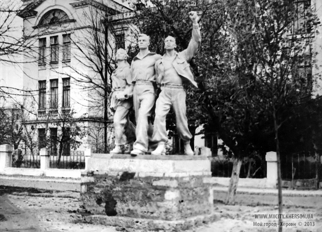 скульптурная группа когда то украшала проспект Ушакова. Херсон, предположительно 30-е годы.на заднем фоне (Больница Суворовского района. Ушакова 22.) Торжественный митинг, посвященный 10 годовщине Великой октябрьской революции. Херсон, 1927 год