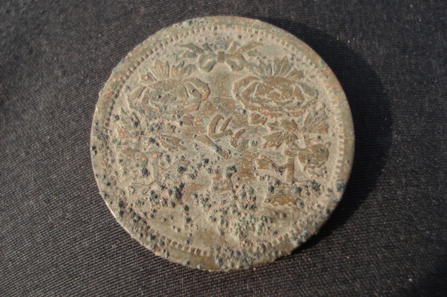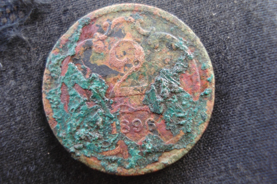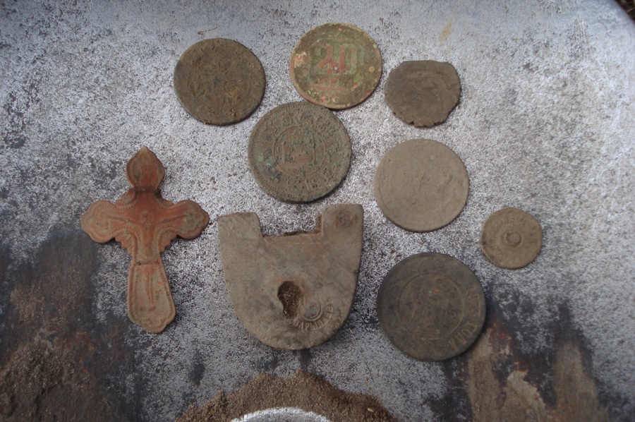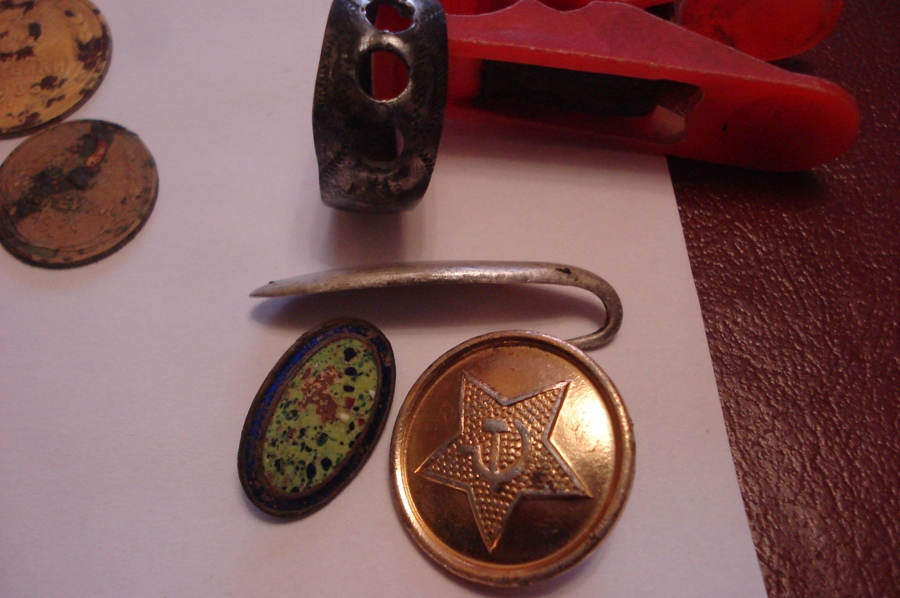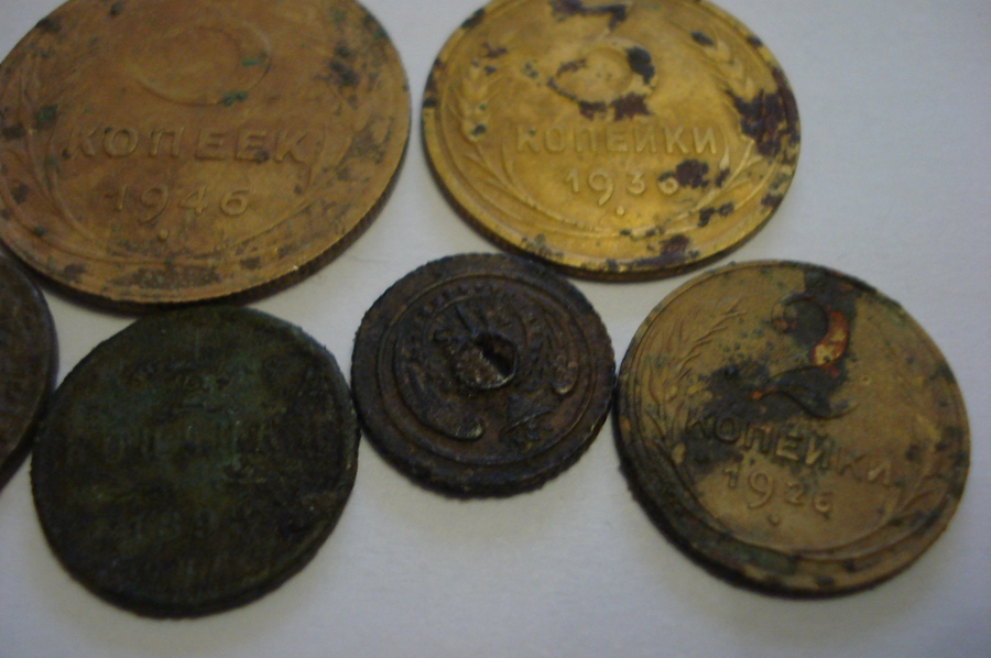 Если блесна серебряная то скорее всего сделана из рубчика или даже медальки... А в прищепке кольцо? Похоже не хватает камешков. Между 1/2 и 2 копейками вроде как крутилка от керосинки или все таки монетка?