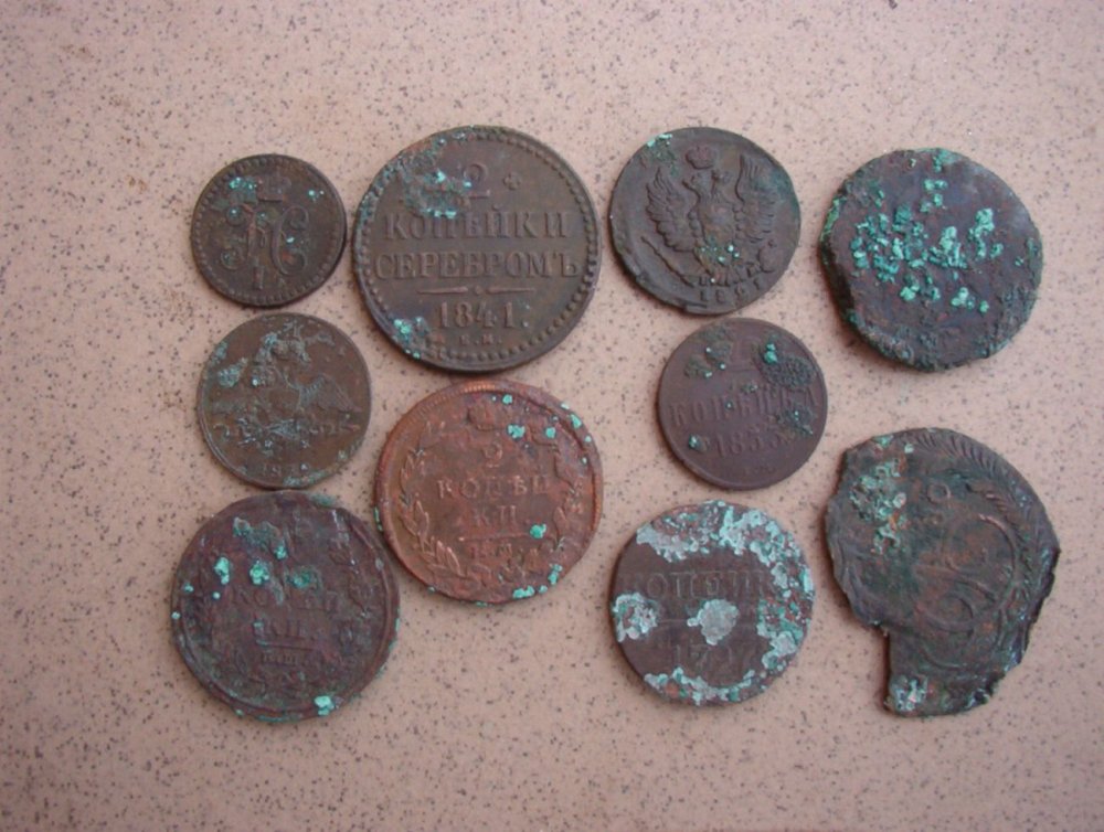 Спасибо! Рубленых пятаков не попадалось. а вот кусок практически растворившегося в нашем грунте поднял и вообще сохран монет на полях превращает их в какалики... Вот пример, очень жаль копейку Павла и двушку Елизаветы...