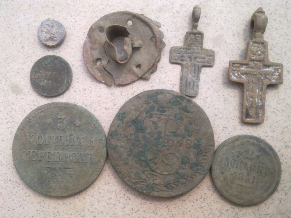 Вот пару часовой крестовый коп сегодня принес неплохой результат. Сначала смотался добить кошелек и поднял в своей же ямке последний пятак - пришлось заново раскапывать лежал боком в стенке, больше сигналов никаких вобще нет! Рядом побродил только пробки пивные... Поехал на хуторок рядом и чудо! Сразу два крестика : тот что побольше даже с остатками эмали, мой прибор вообще крестики плохо видит - я за это время больше потерял их чем нашел , к тому же крестики вроде как под 18 век, а монетки все 19го что рядом были, к стати первый трюндель Н1 попался в сохране, жаль по монетному двору лопатой заехал...Место интересное только до сбора урожая закрыто - прям после меня поле засеяли, и жена срочно домой вызвала - так что на весь коп ушло два часа и почти столько же на дорогу - ну и прибыль должна компенсироваться убытком - раздолбал низ бампера и защиту картера на машине - что то мне кажется что езжу постояно по тем 3% неотремонтированых дорог в Украине блин колея после трактора в поле лучше дороги регионального значения! Еще проблема: снова не могу открыть для просмотра мелкие фото коллег поэтому влаживаю свои большие...