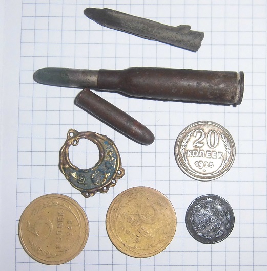 Вот ,тоже немного копнулось. Гильзы не фоткал. Поражает обилие таких пуль на небольшом участке..... Свинцовых ,только 5 штук....