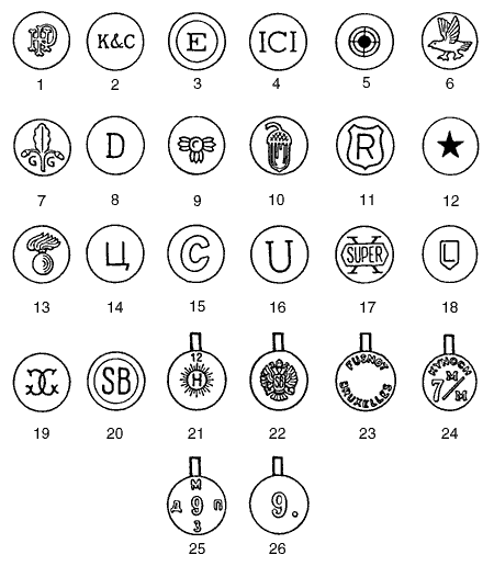 таки да!! шпилечный патрон! Австрия: 1. — Хиртинбергская патронная фабрика; 2 — Келлер и К°, Хиртинберг. Великобритания: 3 — Элей, Лондон; 4 — Ай-Си-Ай, Венгрия: 5 — завод "Нитроген", Будапешт. Германия: 6 — Браун и Блом, Дюссельдорф; 7 и 8 — Г.Геншов и К° (Геко), Дурлах; 9 — ДВМ, Карсруэ; 10– 12 —- РВС, Нюрнберг. Италия: 13 — Д. Фиоги, Лекко. СССР — СНГ: 14 — клейма на целевых патронах. США: 15 — "Каскад", Льюистон (Айдахо); 16 — Ю-ЭМ-Си, Бриджпорт (Коннектикут); 17— Федеральная корпорация по производству патронов, Миннеаполис (Миннесота). Финляндия: 18 — патронный завод, Лапуа. Франция: 19 — Жевело и Гопиля, Париж. Чехия,Словакия: 20 — Бланстрой (бывший Селье и Белло), Прага. Австро-Венгриz: 21 — Хиртенбергская патронная фабрика, Хиртенберг; 22 — Селье и Белло, Прага. Бельгия: 23 — Ш.Фуено и К°, Брюссель. Великобритания: 24 —- Кайнок, – . Россия: 25 — Московский дроболитейно-патронный завод; 26 — –, –.