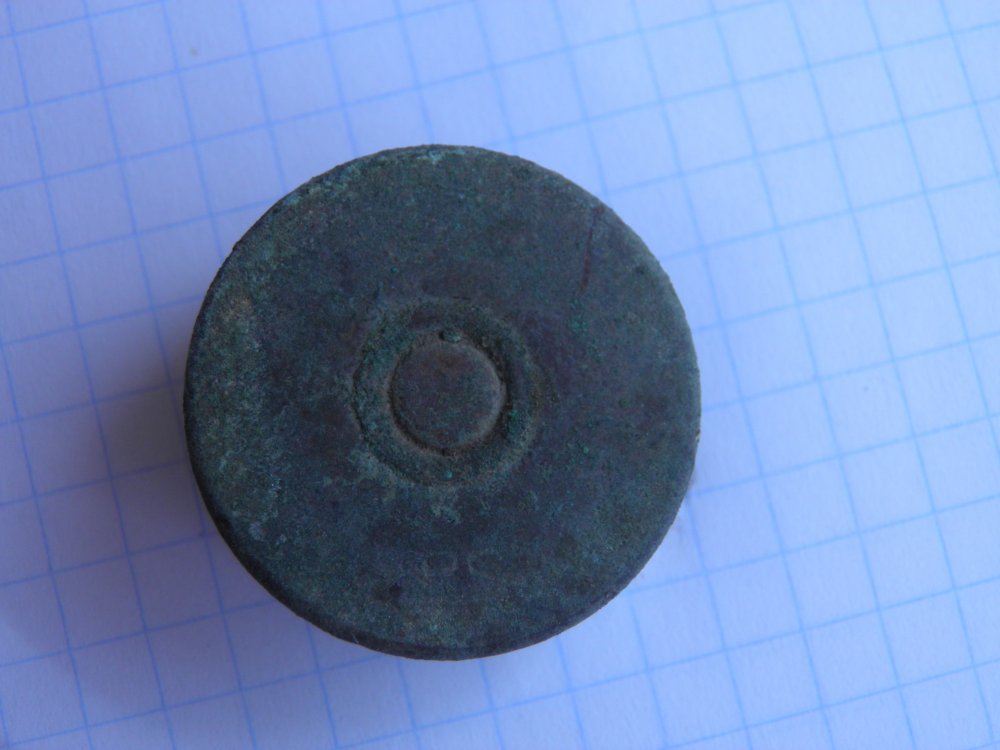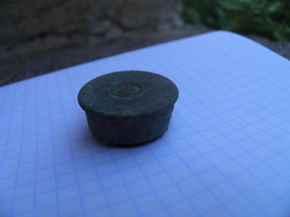 Вот,вчерашние находки.Заинтересовала латунная цельная пуля,с клеймом на торце(чищенная).Может-быть кто-то про неё что-то знает?