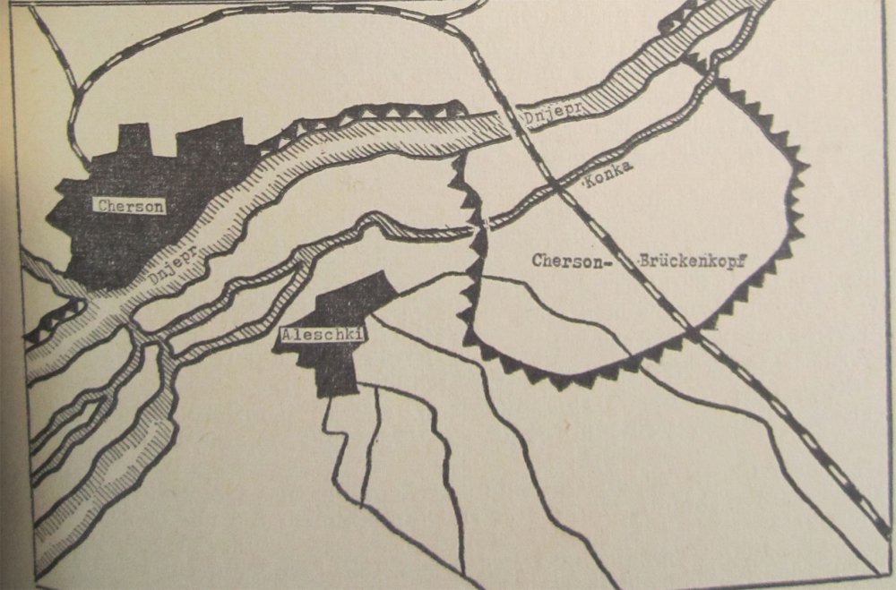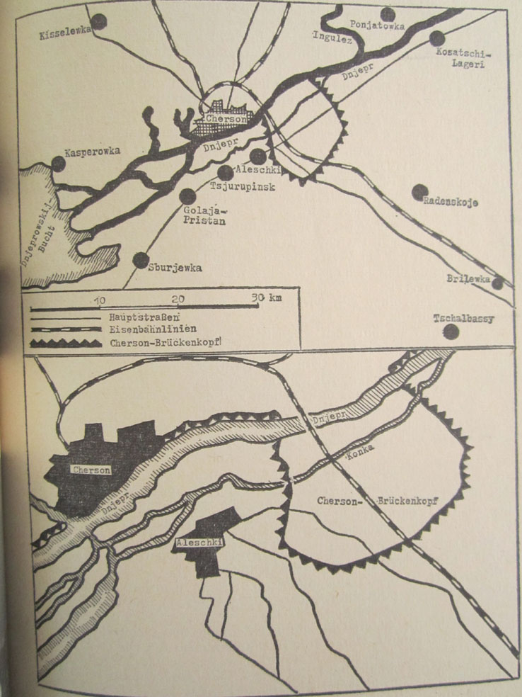 Тоже думал, где там может быть стенка... Может Херсон изображен? По тексту нужно смотреть! На второй схеме изображен сам плацдарм, а также оборона по правому берегу, проходящая через Херсон. Там страниц 40 текста, не уверен, что нужно выкладывать сканы всех стрниц, нужно, что бы кто то взялся перевести и изложил самые интересные моменты....но нужно владеть немецким в совершенстве, по другому - будут в напряг!