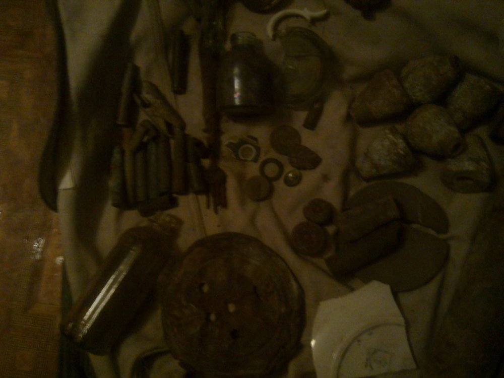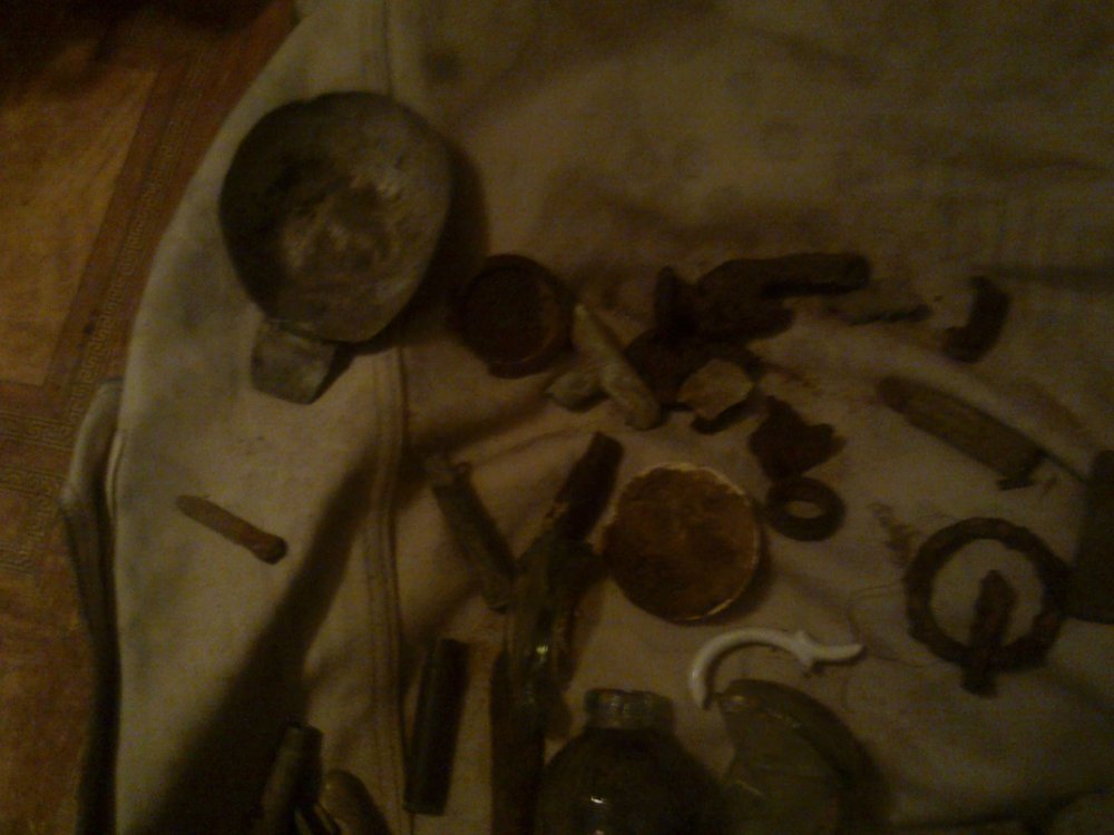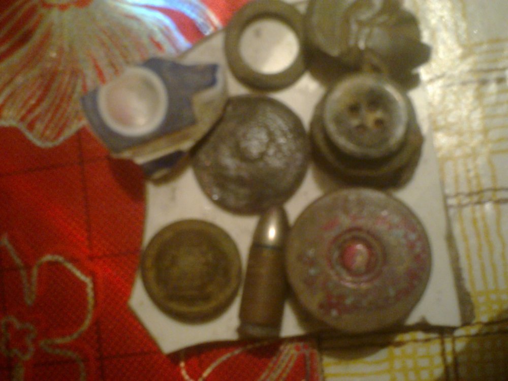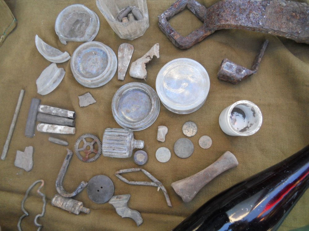 Керамические и стеклянные баночки - от крема, на первом фото верхняя ржавая приблуда- гайки крутить на телегах. Стекло кстати знакомое, проскакивает по 40-50-м годам. Не на одних помойках случайно роемся, лол? Хотя вряд ли.